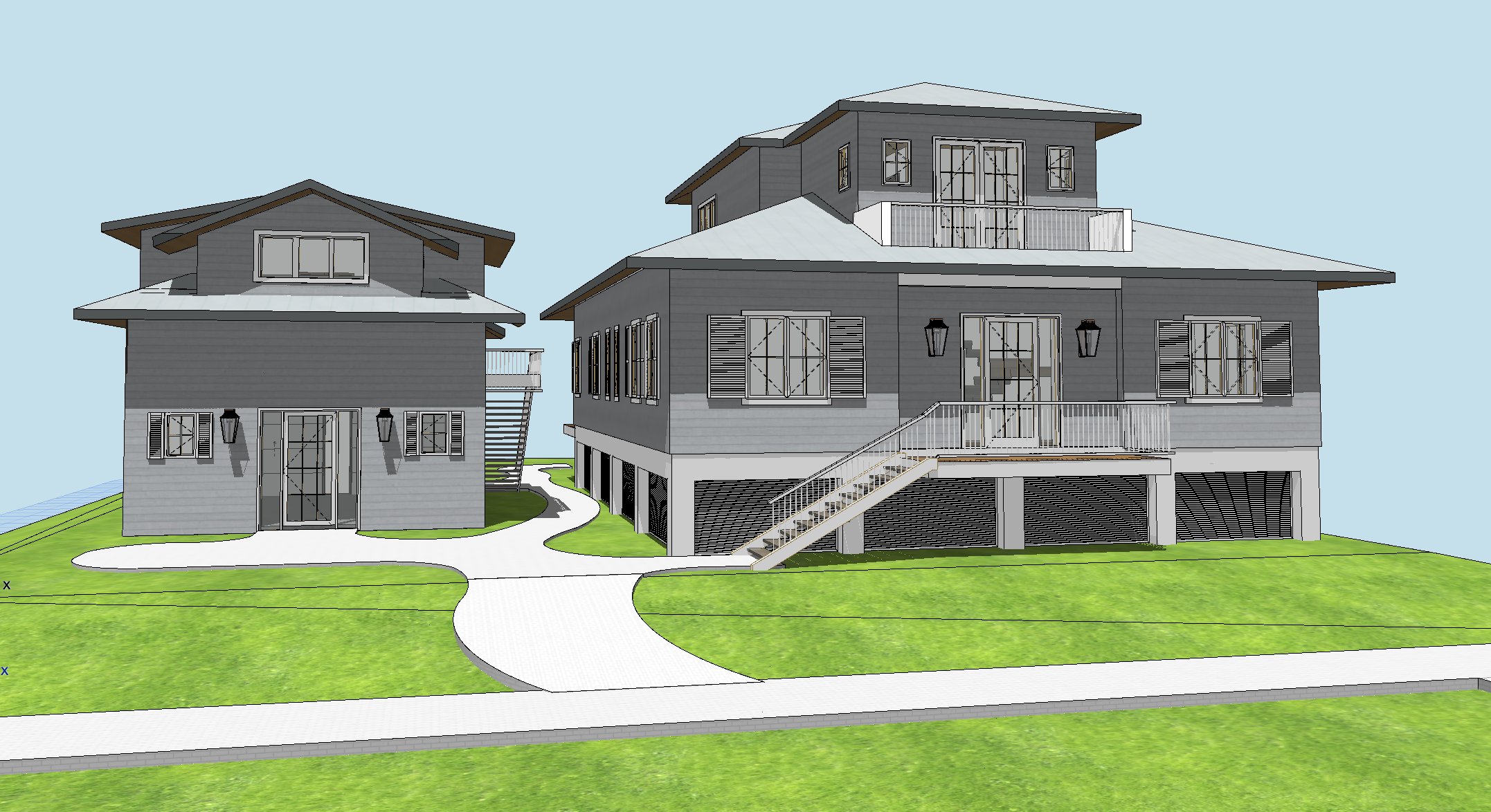 exterior shot keep all elements and proportions exactly as is add siding and roof materials make the image photo realistic add landscaping