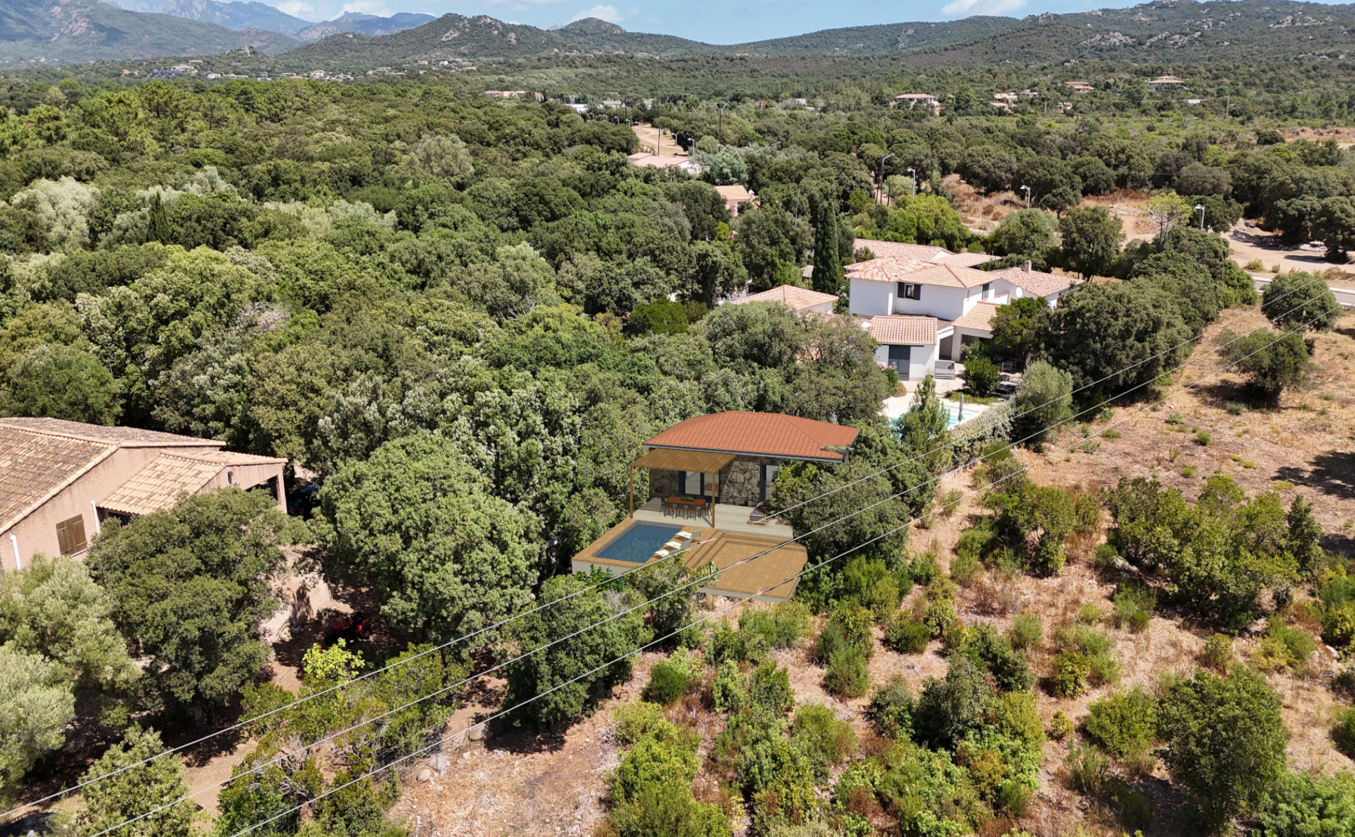 aerial shot windows in grey ral 7016 wall are with stones the surround of the pool is in wood and the roof with mediteranean style