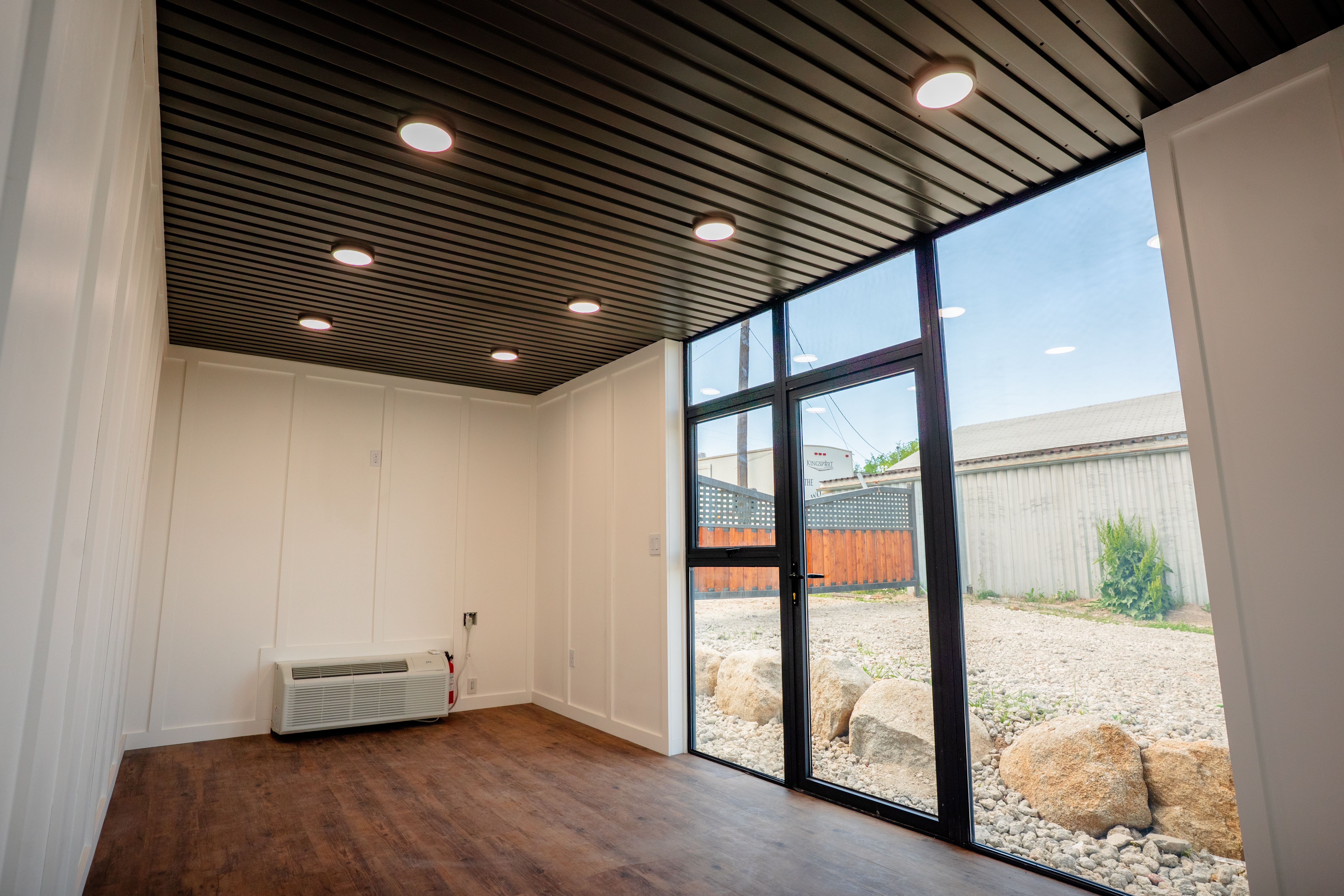 put a sauna taking up that whole back wall then transform the space into a wellness room with different walls and flooring