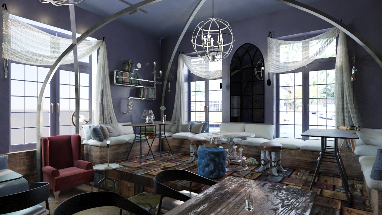add more light to the interior without adding any more light sources and add cafe terrace view from the left window