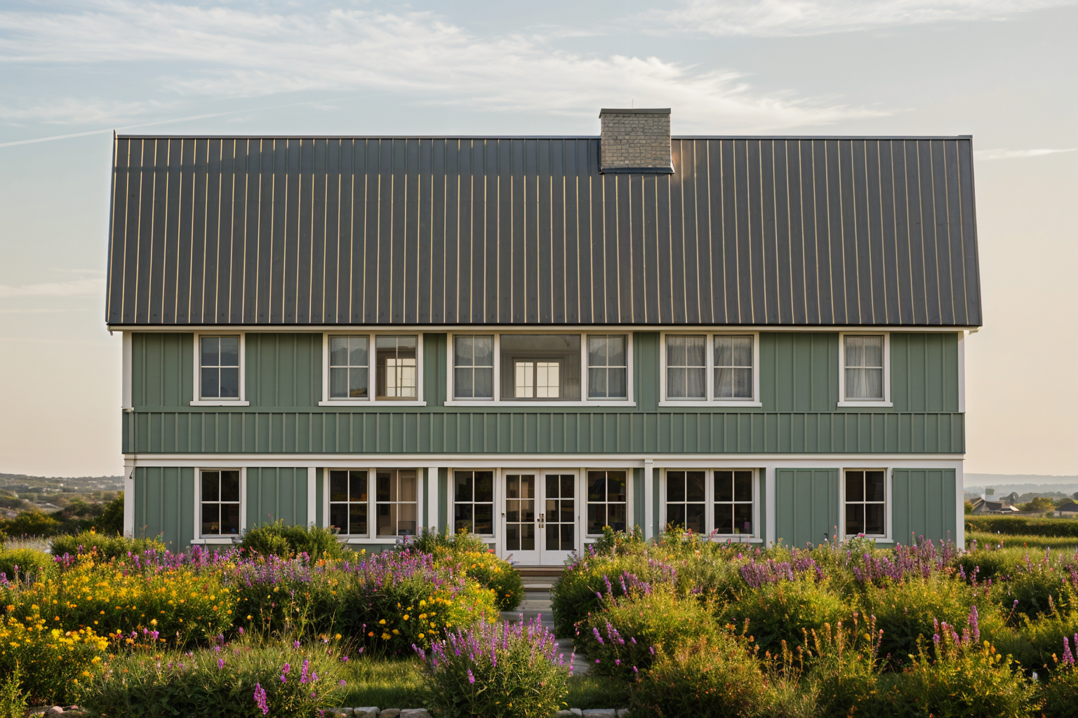 modern architecture office building surrounded by bushes trees reflections in the windows inside desks chairs seen through the windows no lounge chairs chairs made of brushed inox tables made of glass surfaces and brushed inox legs sunlight coming in equipment seen through the windows benches and greenery next to the building