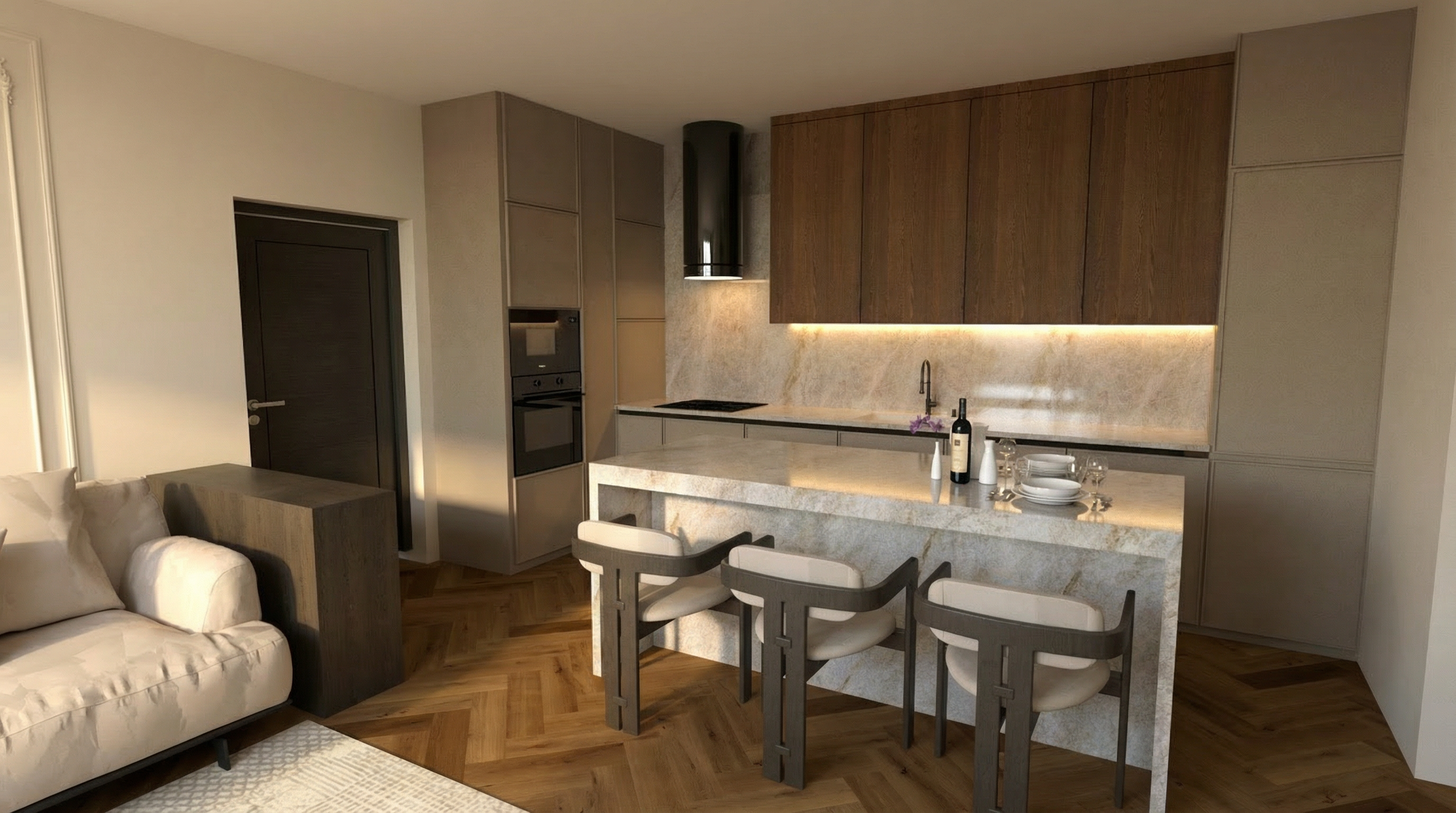 an elevator lobby with matte green walls the floor is made of beige marble the elevator doors are finished with green sticker paper a white sticker is draped on the elevator walls like a sticker the ceiling is a red painted drop ceiling with cove lighting on both sides above the elevator doors and recessed pin lights in the middle a glass door is at the end of the hallway