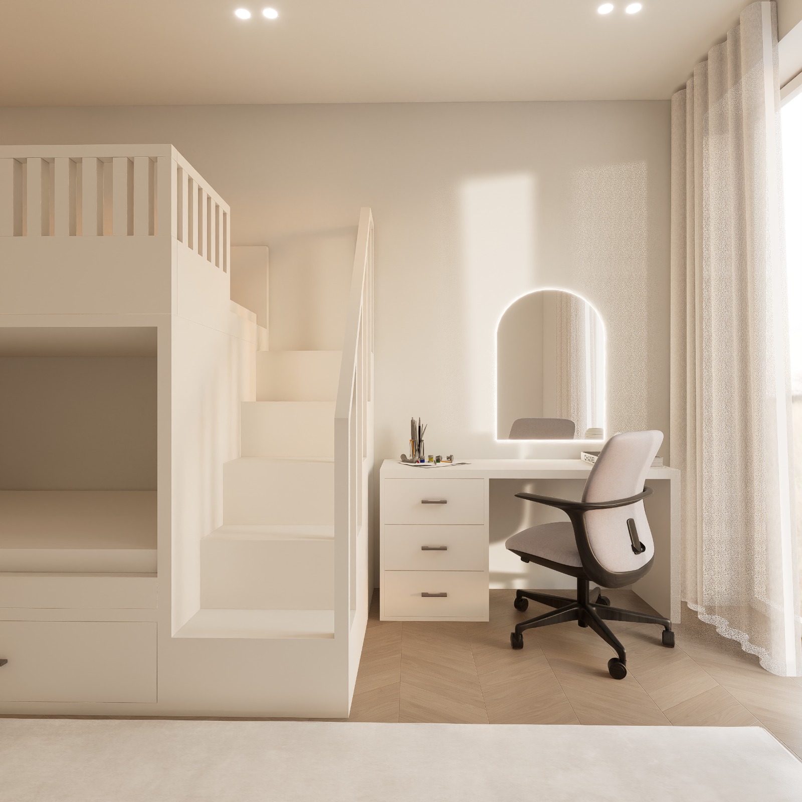 ultra realistic interior render keep exact same design layout proportions and camera angle do not change any geometry furniture placement framing or perspective do not move the camera materials bunk bed in matte painted wood off white with subtle surface texture and soft edge definition mattress and cushions in soft fabric with visible textile grain and natural compression desk and drawers in matte lacquer finish with soft reflections and slight tonal variation chair with fabric upholstery and matte plastic metal base with realistic material separation walls in warm beige matte paint with subtle micro texture curtains in light linen fabric semi transparent with natural light diffusion floor in natural oak wood with visible grain and tonal variation lighting strong natural daylight entering from the right side casting soft directional shadows slightly overexposed window light for realism warm ceiling spotlights 3000k with soft falloff introduce shadow depth under the bunk bed and stairs soft uneven light gradient on wall avoid perfectly clean highlight environment minimal but realistic slight imperfections in fabrics and materials desk objects natural and not perfectly aligned style ultra photorealistic high end interior photography soft contrast natural imperfections 8k global illumination ray tracing strictly preserve original design no color deviation no perspective change