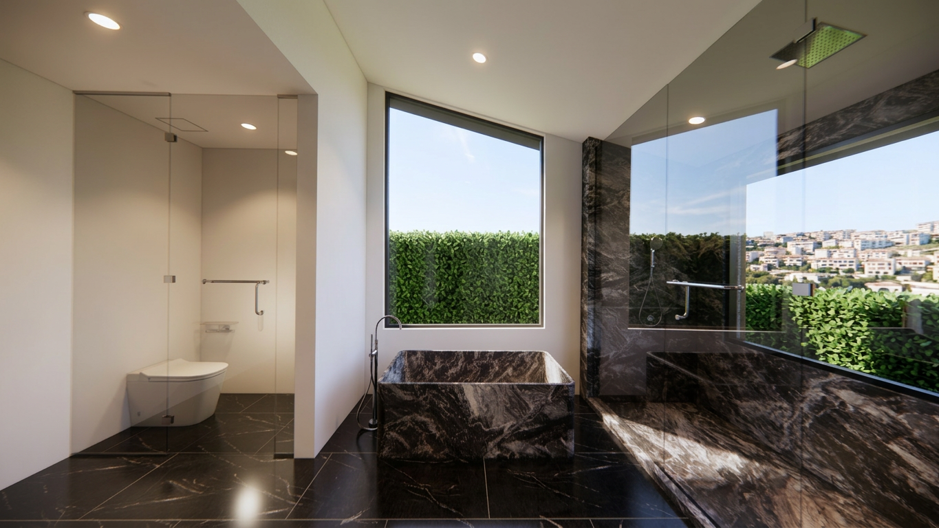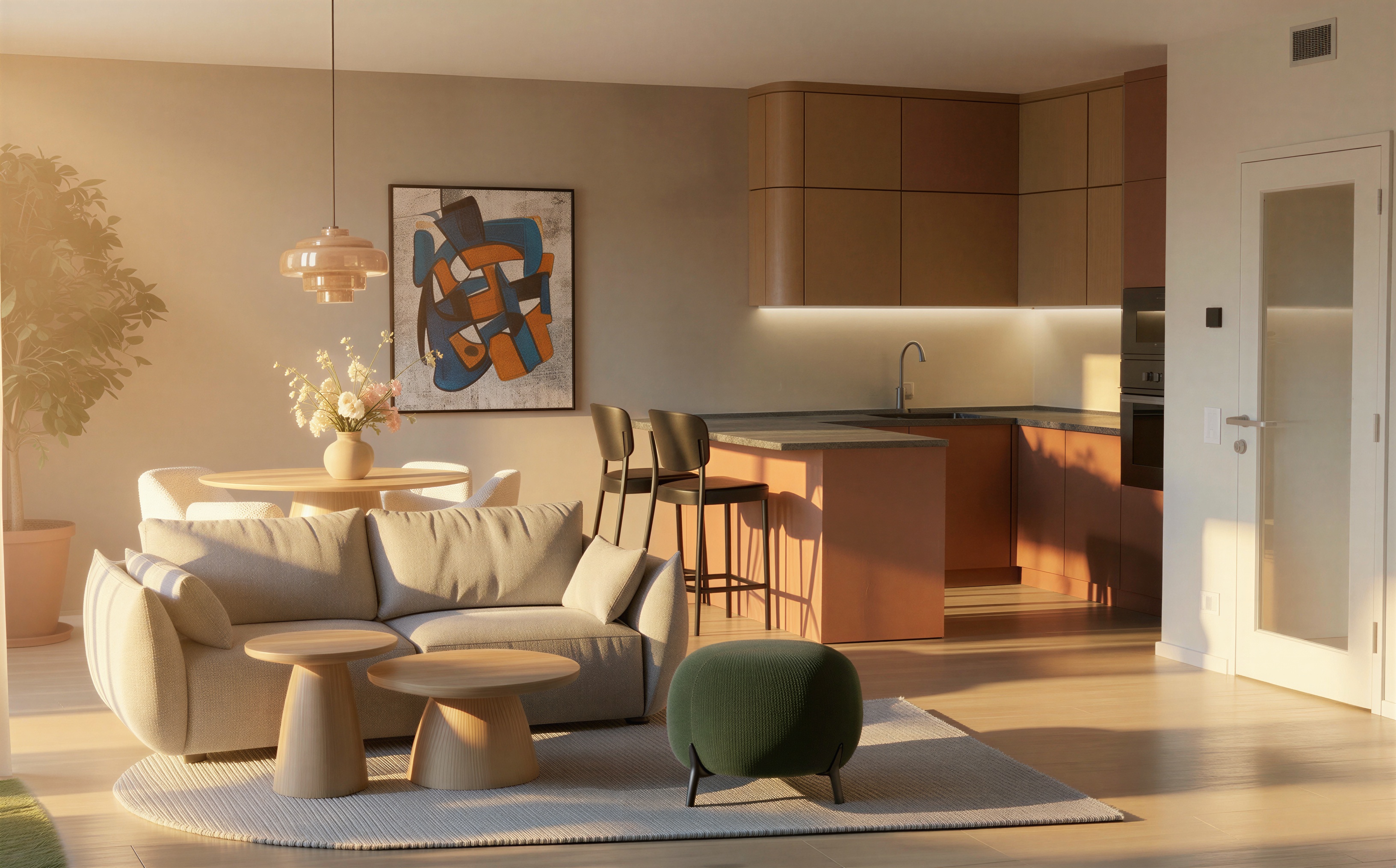 use the provided render strictly as the base image keep the camera angle layout furniture placement lighting materials and architecture exactly the same modify only the shape of the rug under the sofa and coffee tables the rug is currently partially rectangular with a straight edge on the right side change the rug so that it becomes a perfect regular circle the rug should have smooth evenly rounded edges and form a clean circular shape centered under the sofa and coffee tables keep the same rug material color texture and scale as in the original render do not change any furniture objects lighting or other elements in the scene only adjust the rug shape so it becomes a circular rug
