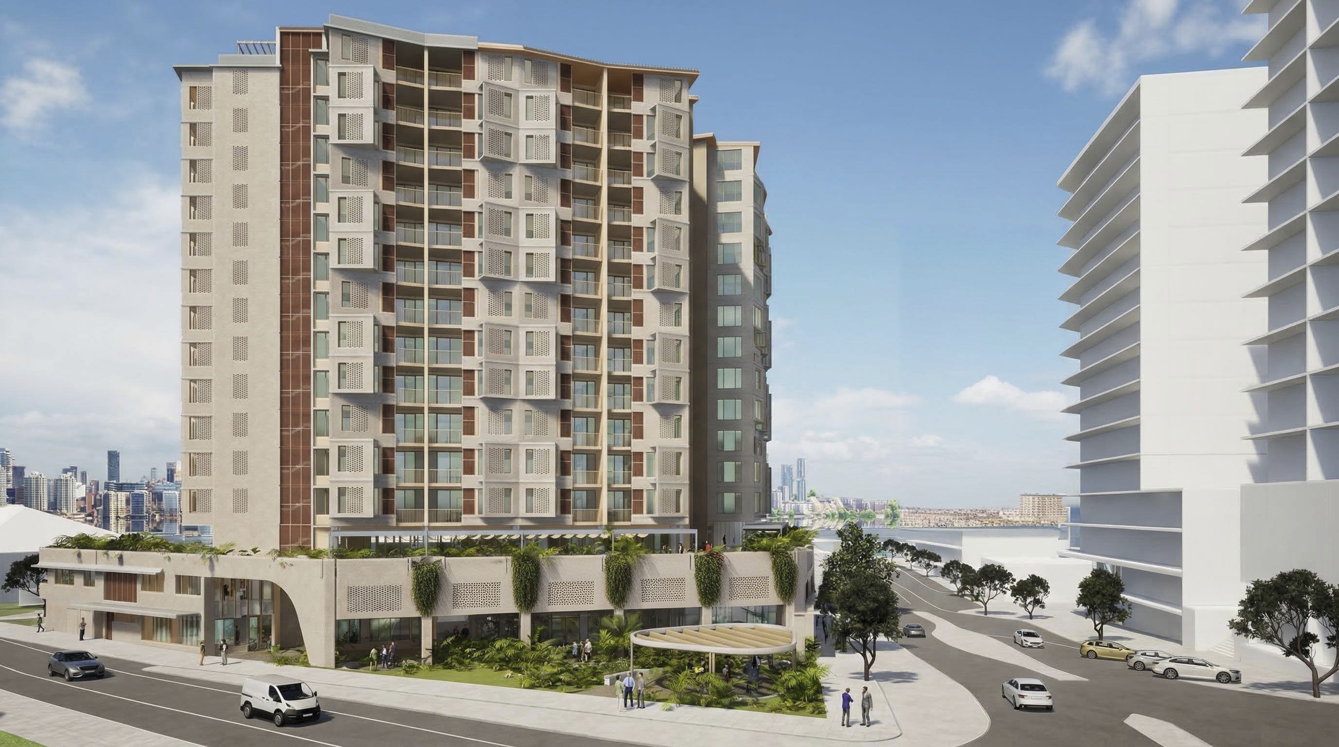 keep the overall building form and structure 100 but include more land scaping to the podium level eeach of thee apartment deck areas and roof include green walls to elevations on the left change the white elevation to make it look like timber cladding make the building have more of a cotemporary coastal feel