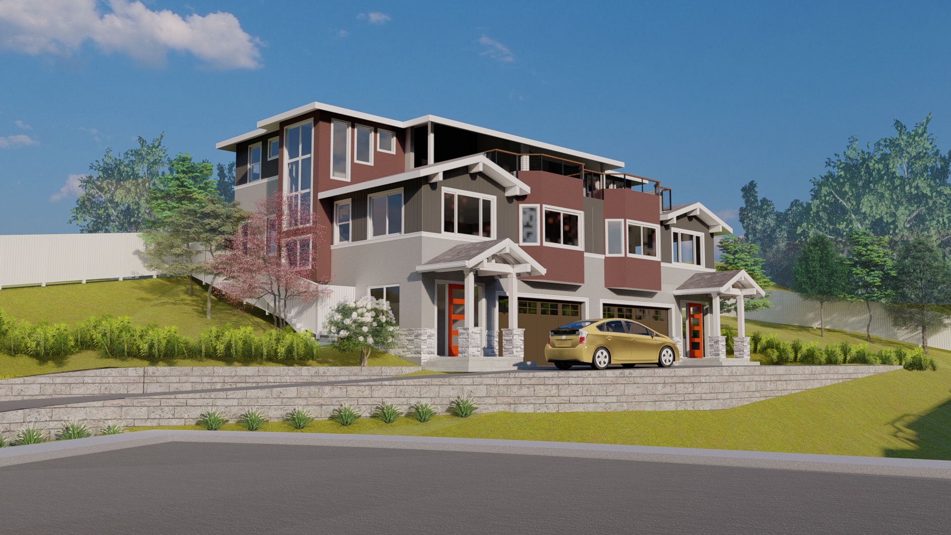 enhance the scene with photorealistic materials and keep the original colors the atmosphere should be serene and inviting with a bright blue sky filled with soft fluffy clouds add low lying landscape native shrubs in green areas