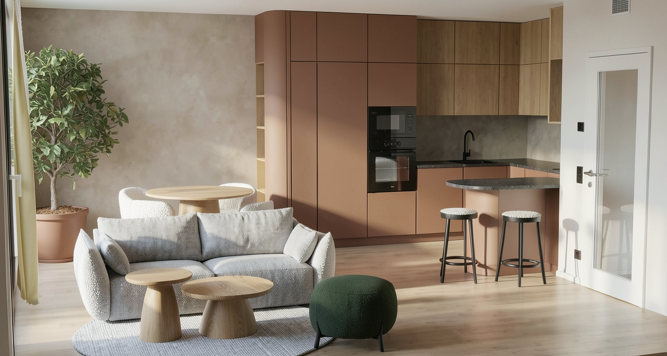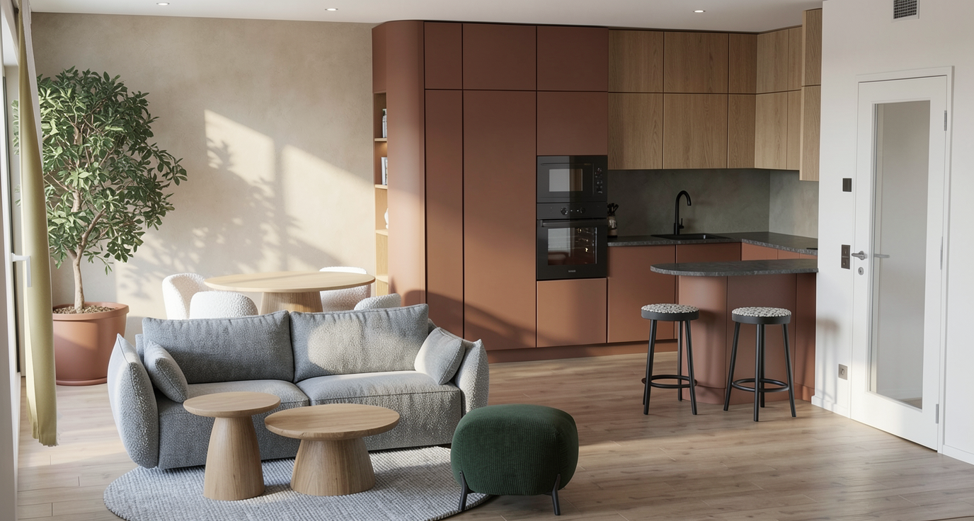 strong controlled prompt use the provided screenshot strictly as the base image for composition camera angle proportions furniture placement and architecture do not change the layout object positions furniture shapes or room geometry only improve materials lighting and realism convert the scene into a highly realistic interior render of a modern open plan living room and kitchen kitchen the lower kitchen cabinets have a warm cinnamon brown color with a matte finish the upper kitchen cabinets are natural oak wood with a soft subtle grain and the same tone as the wooden tables in the room the kitchen countertop is dark grey stone with a very subtle almost uniform texture and minimal veining install a continuous led strip light underneath the upper kitchen cabinets creating soft under cabinet lighting that gently illuminates the countertop instead of a backsplash the wall behind the kitchen counter is finished with a warm toned cement plaster concrete microcement surface with a soft natural texture walls the wall behind the dining table has the same warm cement plaster finish as the wall behind the kitchen countertop the finish should have a warm beige grey cement tone natural variation and a smooth hand applied texture wood elements the following elements are natural oak wood with a consistent tone coffee tables in the living area dining table behind the sofa upper kitchen cabinets shelving niche on the right side of the tall kitchen cabinet the oak should have soft subtle grain with a calm natural appearance furniture bar stools are black wood with a matte finish coffee tables are solid oak wood dining table is oak wood in the same tone as the coffee tables dining chairs around the dining table are upholstered in white boucl fabric with a pronounced textured surface the chair legs have the same cinnamon brown color as the kitchen cabinetry textiles the rug is light grey with a pronounced woven textile structure the sofa is upholstered in fabric slightly darker grey than the rug the round ottoman in the foreground is upholstered in dark green fabric lighting natural daylight enters from the left side of the room producing soft realistic shadows and balanced interior illumination the under cabinet led lighting adds a subtle warm glow across the kitchen countertop style calm modern interior scandinavian inspired design natural materials warm tones soft textures photorealistic rendering quality global illumination high detail materials important constraints do not modify camera position furniture placement object proportions room layout architectural elements only enhance materials textures lighting and realism