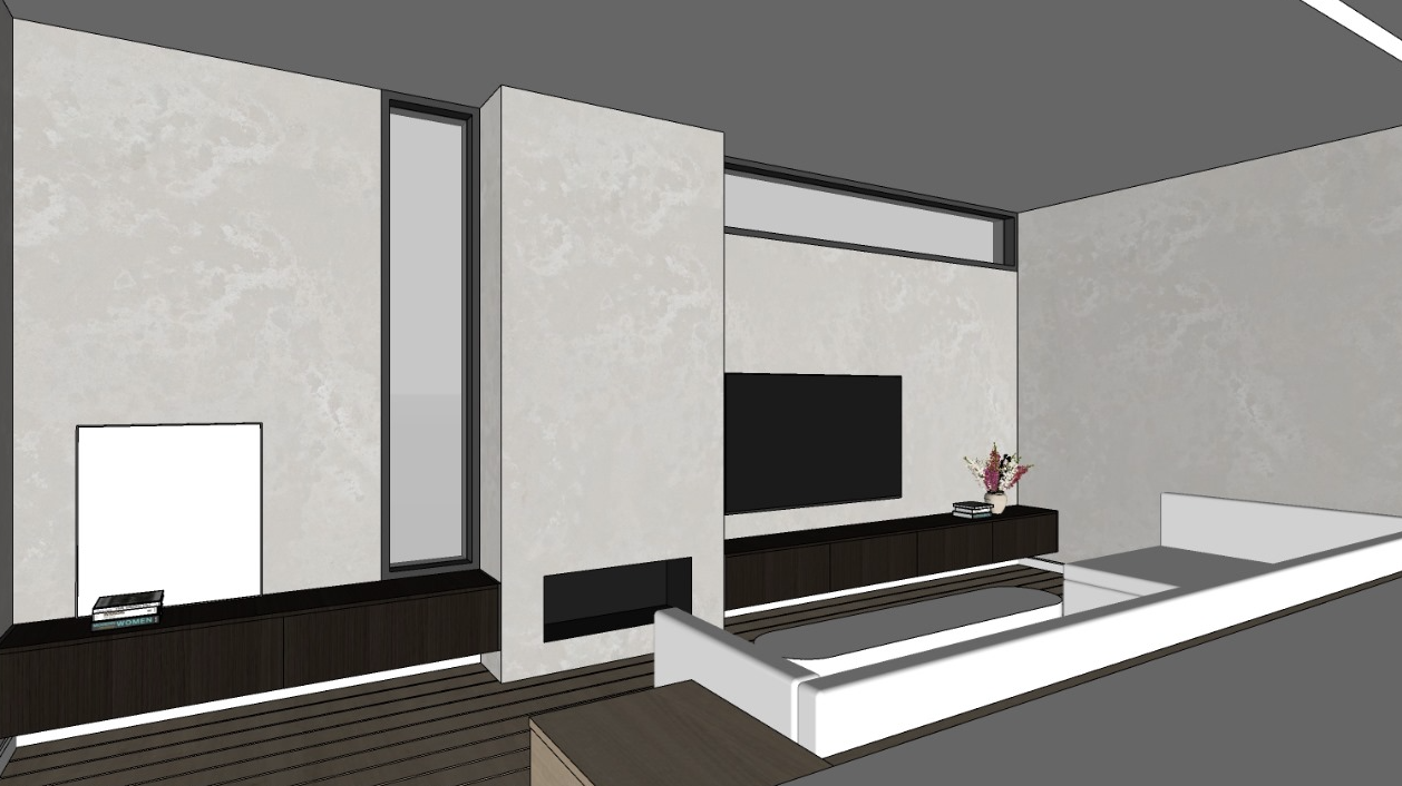 modern organic living room with soft limewashed off white walls and subtle tonal movement slightly rounded gyprock edges throughout large light tumbled limestone tiles in french pattern flooring custom floating joinery in light oak veneer similar tone to floor but slightly lighter and matte finish jardan furniture including low profile modular sofa in warm neutral linen sculptural armchair and minimal timber coffee table soft natural daylight entering from full height glazing warm calm luxurious atmosphere architectural digest style photography editorial composition soft shadow gradients no harsh contrast matte mineral finishes note this is a sunken lounge