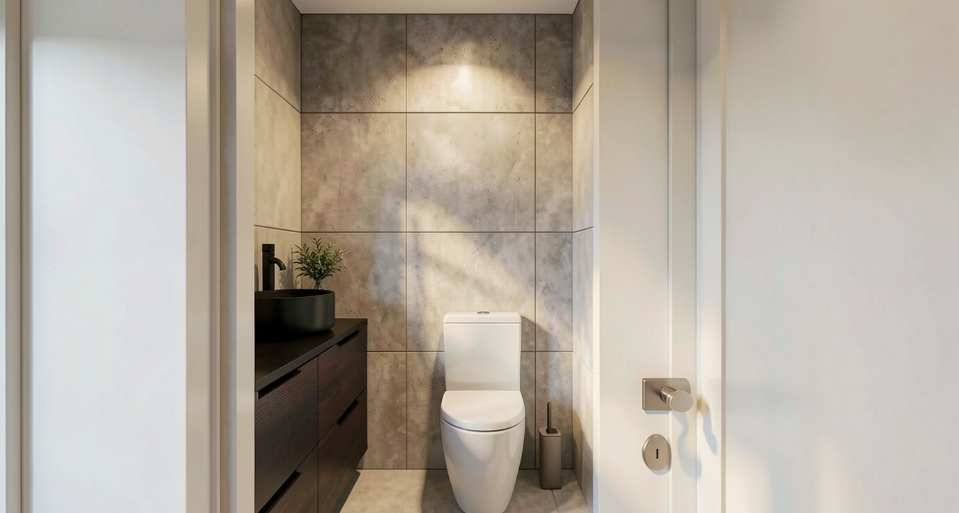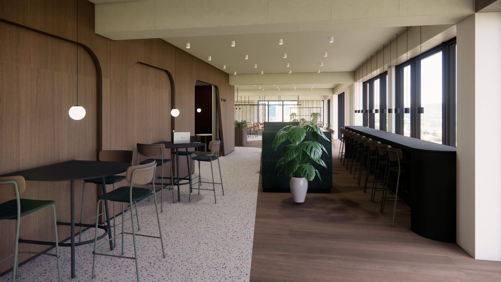 render a beautifully modern office dining area with large windows capturing natural light use a warm brown wood floor contrasting with a terrazzo floor incorporate soft cream curtains flowing near the windows enhancing the light airy atmosphere the ceiling is an acoustical spray on ceiling beige