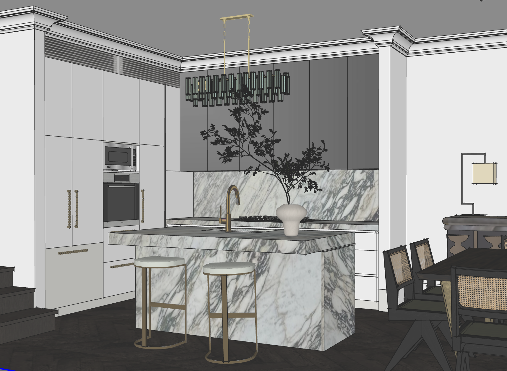 too many plants only keep the one on the island overhead cabinets above splashback are silver mirror not grey