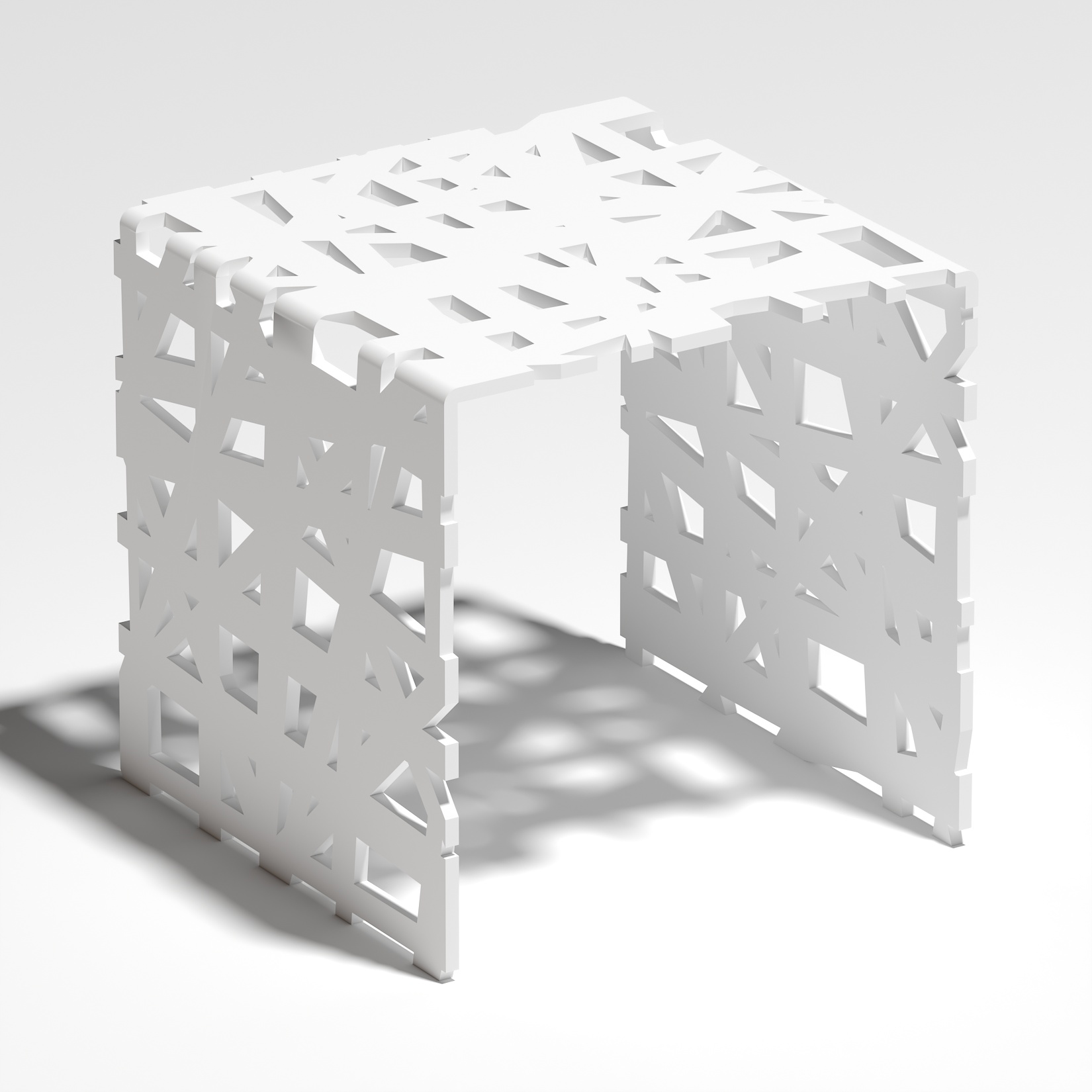 modern interior shot create a minimalistic modern stool with an intricate lattice pattern design the stool is a crisp pure white color with smooth edges casting soft detailed shadows the background is a gradient of light gray to white enhancing the clean and elegant aesthetic the atmosphere is serene and contemporary emphasizing simplicity and sophistication architecture