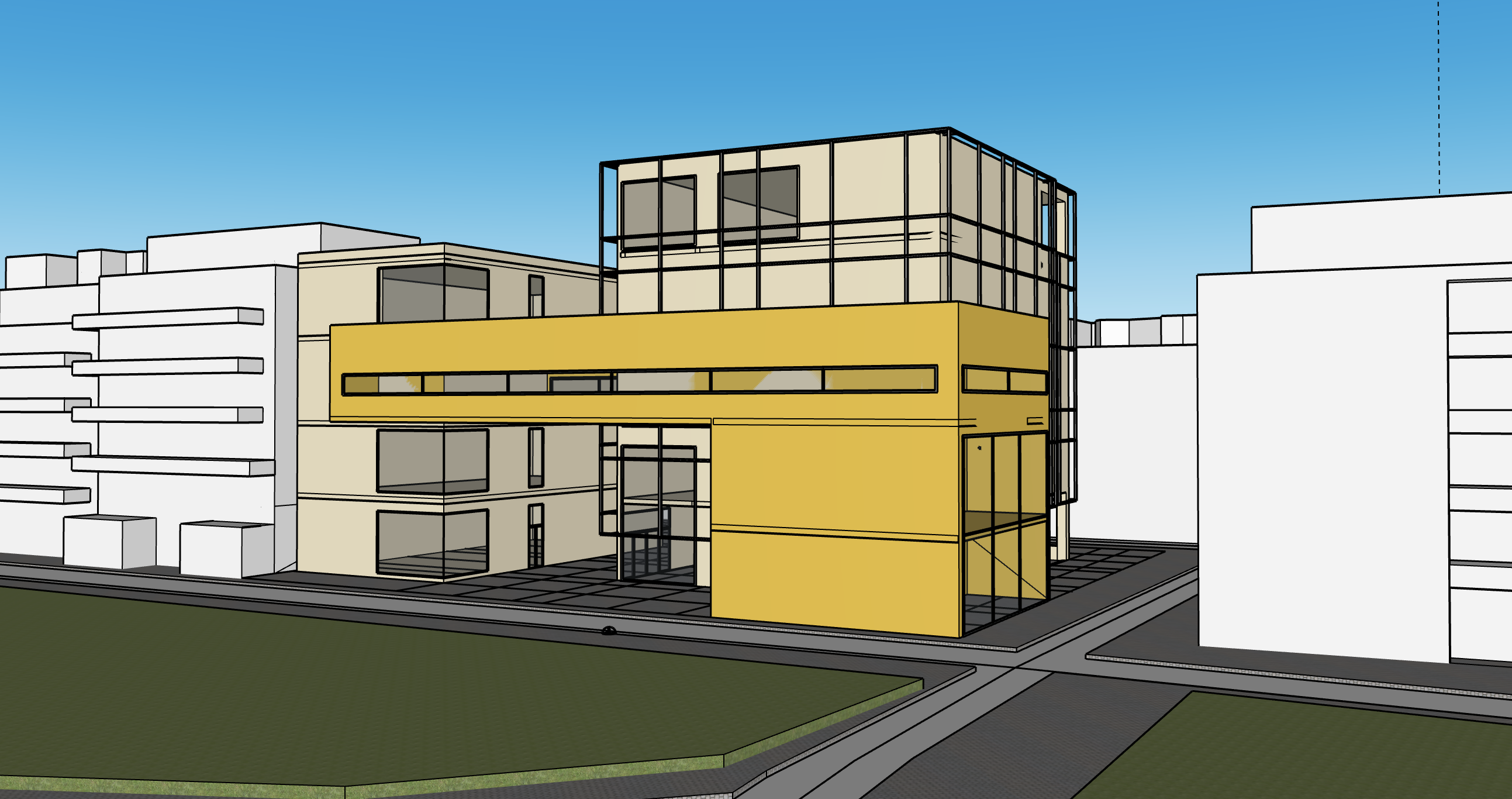 this is my bauhaus museum in athens greece make it realistic so i can show my professors the materials i want for the building 1 the yellow building will be bright yellow concrete 2 the other two buildings currently the beige ones will be light color concrete 3 all the other buildings surrounding the museum make them gray 4 all the frames are black aluminium and the windows are glass 5 around the highest building there is a white metallic grid as shown it will be still metallic but inside the grid there is white metallic mesh with little holes 1 5cm radius each so it will give the illusion that you can see behind the mesh the grid is inside the white horizontal and vertical lines not on the wall of the building 6 all the roofs have vegetation 7 the highest building has 5 stories 4 5m height each