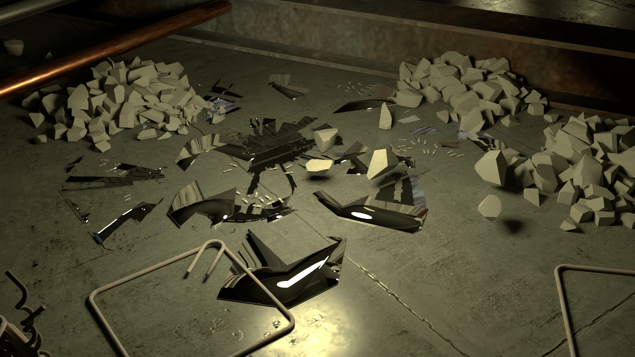 add more quality to the rubble like metal and dirty concrete put more texture on the back grey wall the light is at night in a tv show with fog