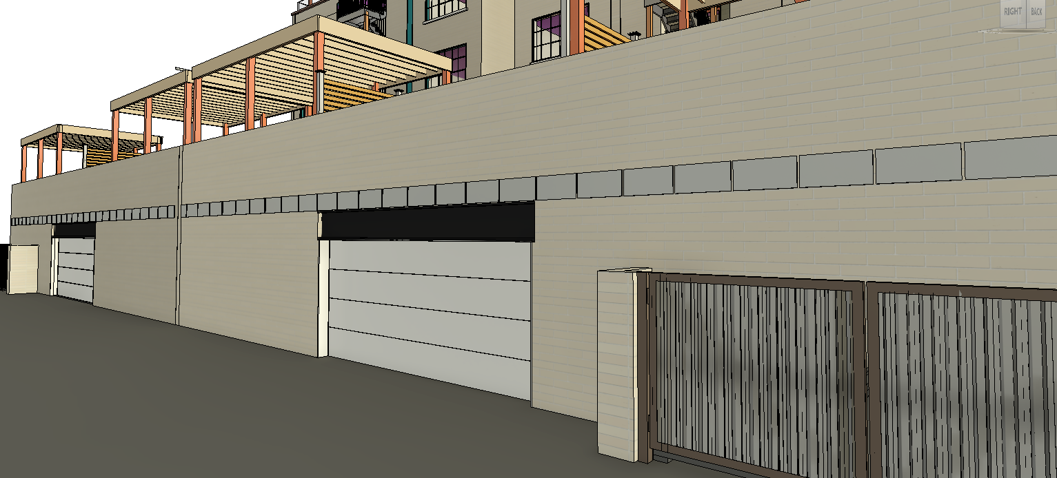 sunny daylight beige brick garage with black metal intel above garage doors and white stone band above the metal intel black metal trash gate infront of building