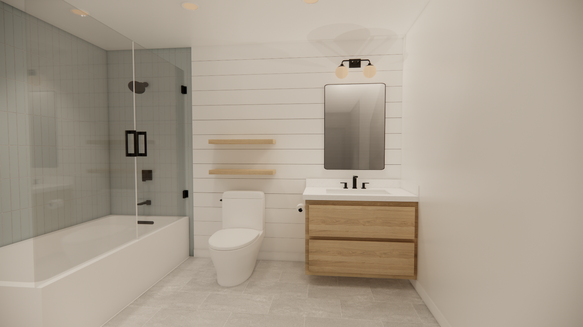 increase the lighting to create a warmly illuminated bathroom make the vanity light glow softly with realistic light diffusion on the wall add warm white light 3000k from the ceiling recessed lights create natural shadow depth under the vanity and toilet add subtle highlights on the tile and glass shower to enhance realism the space should feel bright warm and professionally lit not flat and keep the cabinetry white oak