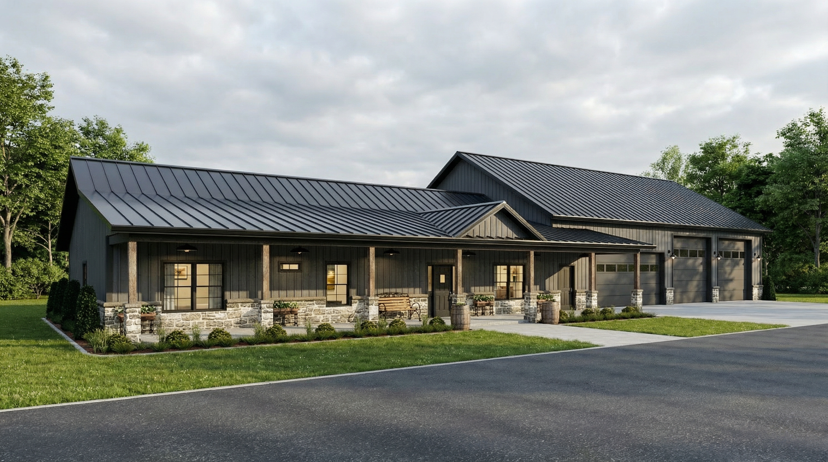 add a simple forest background basic simple landscaping a driveway to the garage and a front porch walkway