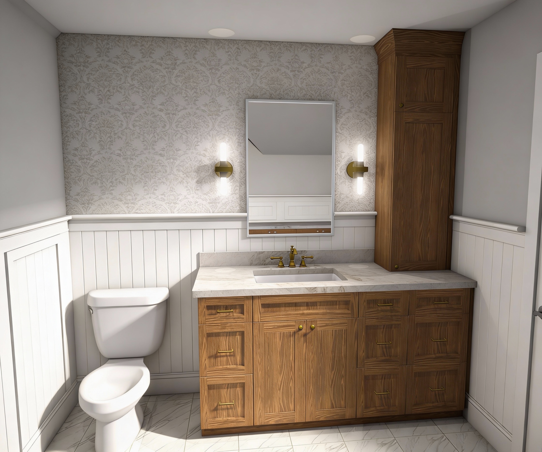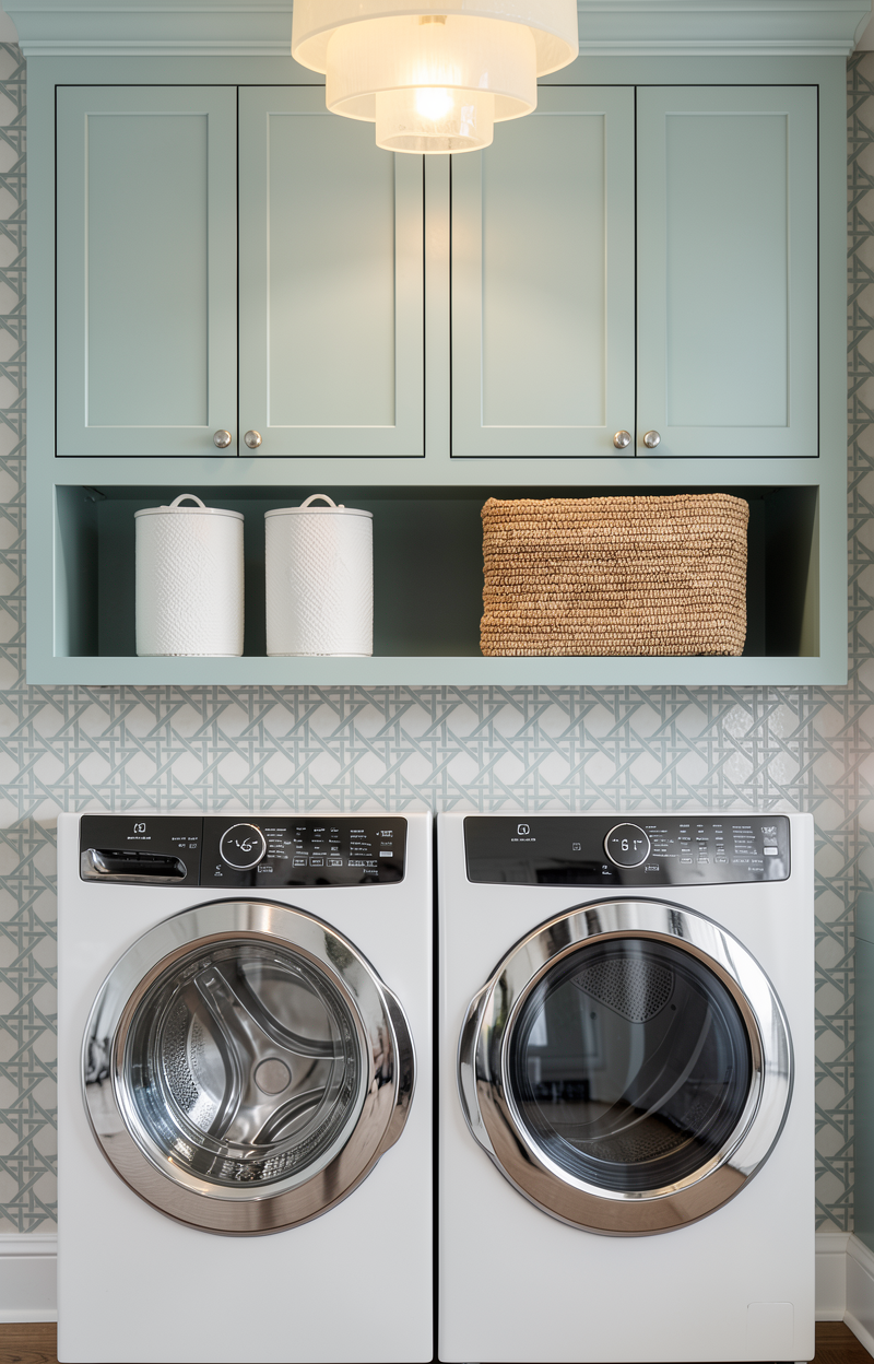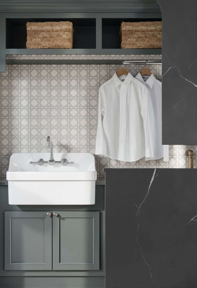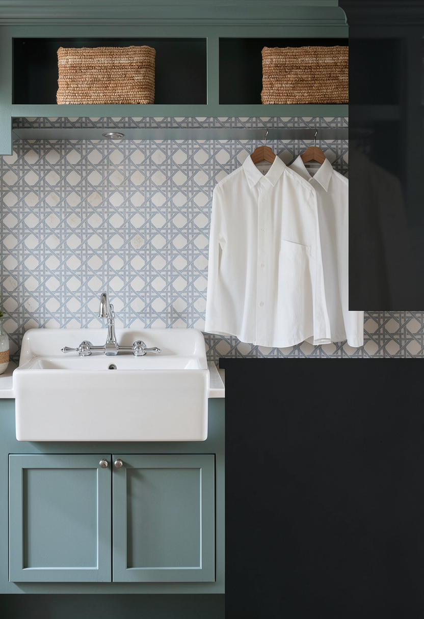 the cabinet hardware and faucet is polished nickel the sink is white porcelain match the blues in the provided image the space should be evenly well lit the shirts are hanging from a chrome rod