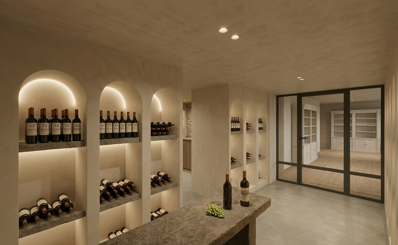 a photorealistic architectural rendering adjustment where the decorative grapes are removed from the tasting table the two wine glasses remain on the table but are now filled with red wine creating a more authentic wine tasting atmosphere a wine bottle remains placed on the table next to the glasses the arrangement should appear natural and minimal maintaining the elegant and refined ambiance of the wine cellar while preserving the exact same table position materials and overall composition