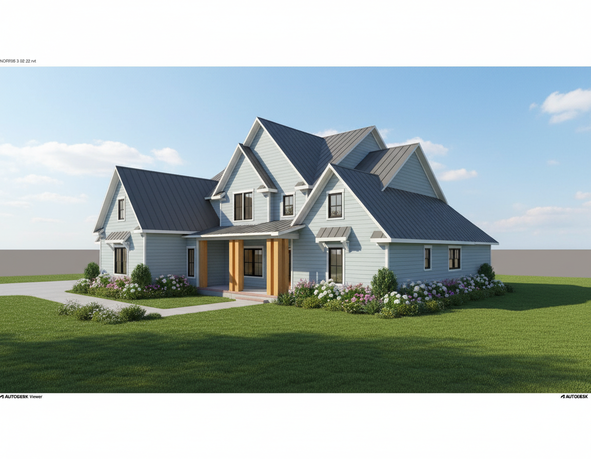 make photo realistic add driveway front walk landscaping with river rock and low mountains in background sun at front of house early afternoon asphalt shingle roof gable fascia trim is dark evergreen except for at front timbers dark evergreen trim and siding