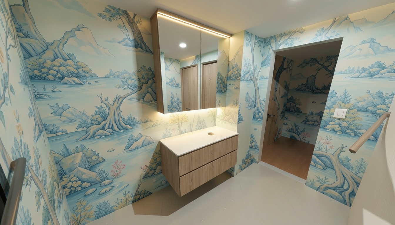 maak het nog foto realistischer boven de spiegel zit er een ledstrip deze mag aan staan geen waskom tekenen enkel effen tablet wit