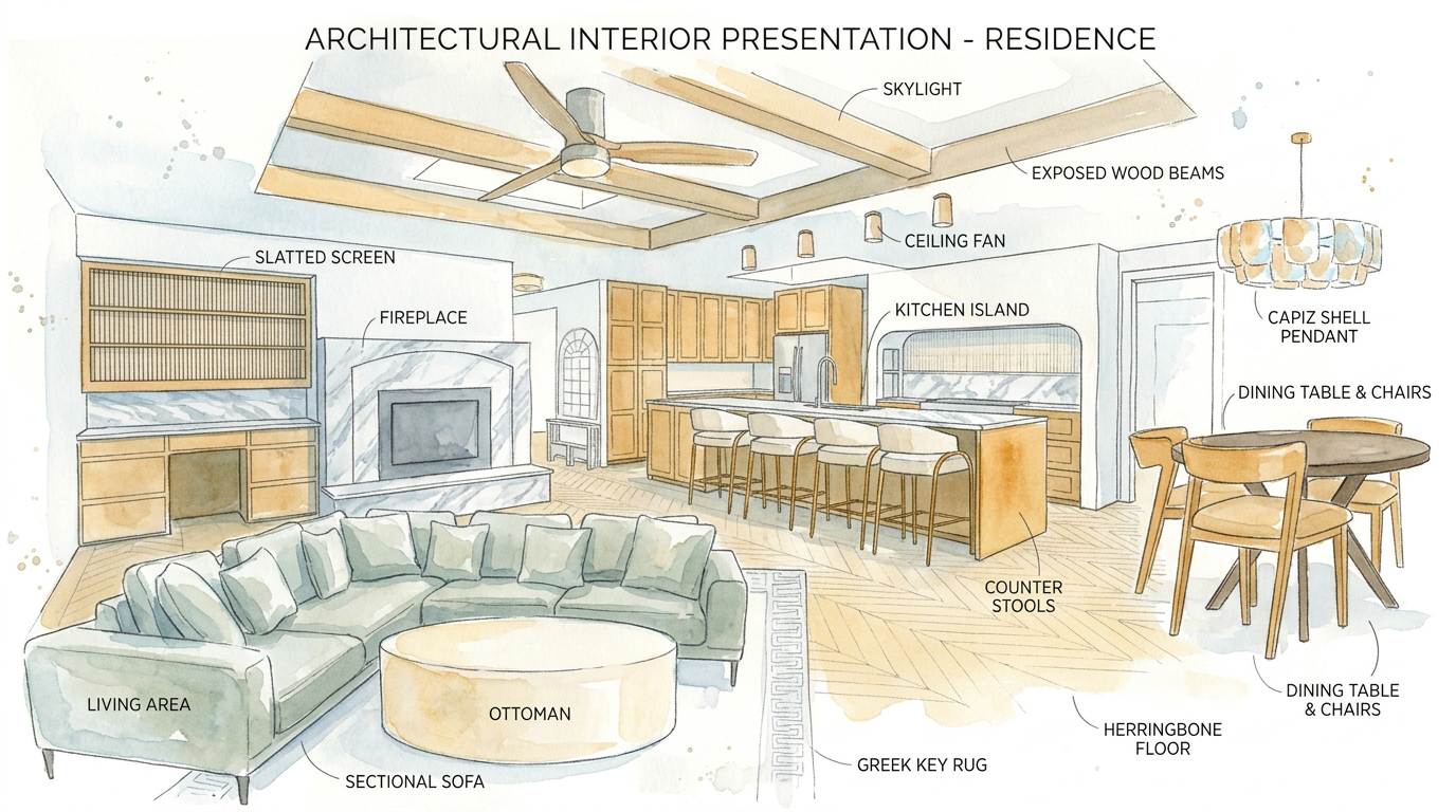 modern soft minimalist kitchen interior presentation quality render view straight on wide shot of an island with four simple timber bar stools and upholstered white seats in the foreground pale oak joinery with vertical grain thick stone waterfall benchtop in warm light beige integrated brass mixer tap and subtle sink background long linear shelf in cream travertine with minimal ceramics and artwork matching travertine splashback large curved plaster rangehood in soft warm white concealed appliances minimal cooktop overall palette warm neutrals light oak cream stone touches of brass no strong colour walls and ceiling in continuous warm off white plaster for a soft cocooning feel lighting soft daylight from unseen side windows gentle shadows two simple black ceiling spotlights and small brass wall sconces glowing softly styling one large vase with relaxed green foliage on the island a few sculptural ceramics and a small lamp on the shelf no clutter materials matte natural finishes subtle texture in stone and plaster slightly oiled timber no high gloss camera 35mm lens eye level perfectly centred orthogonal perspective minimal distortion mood calm refined mediterranean inspired contemporary home high end residential render in 5k global illumination soft bounce light high realism subtle depth of field clean edges no people