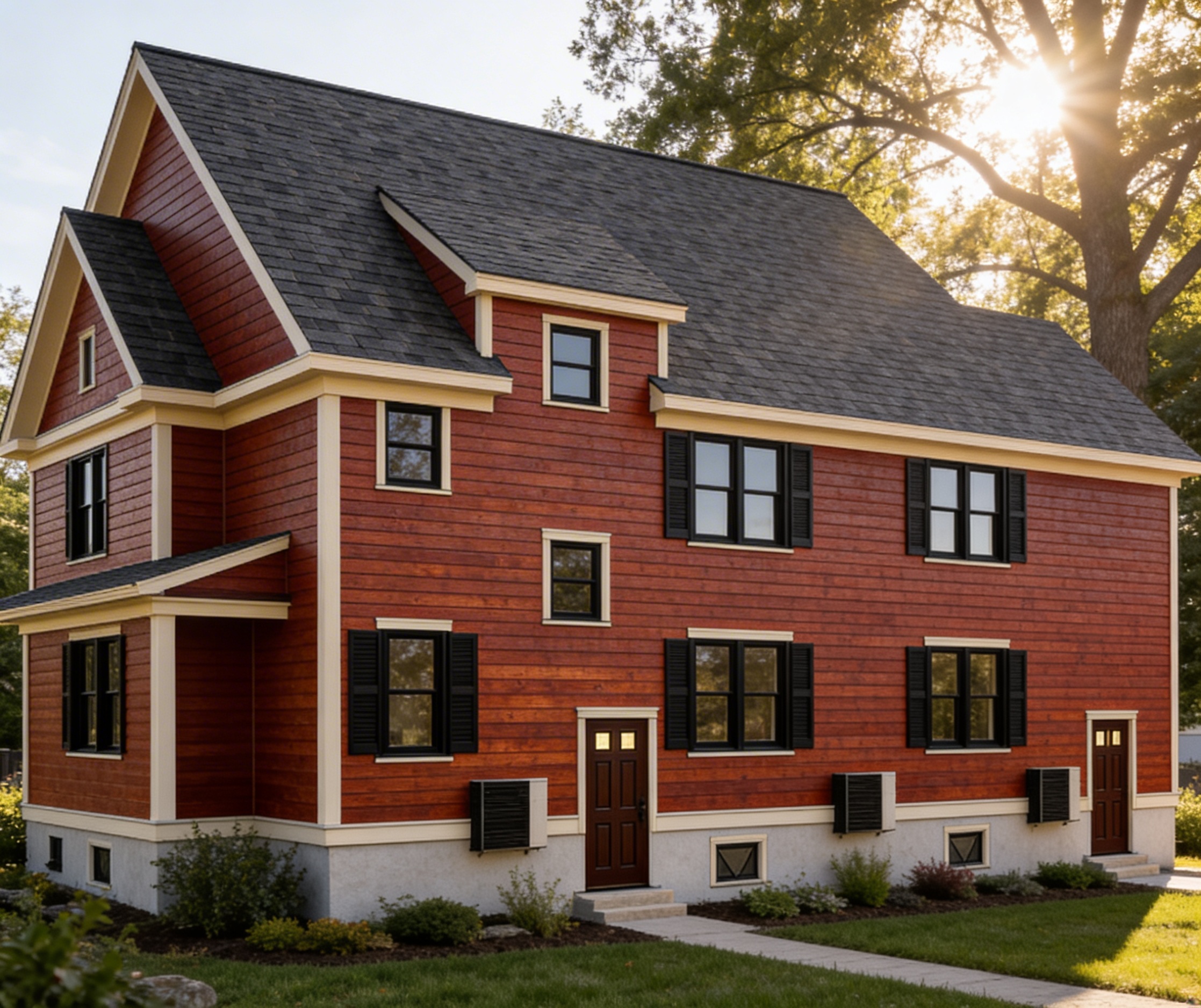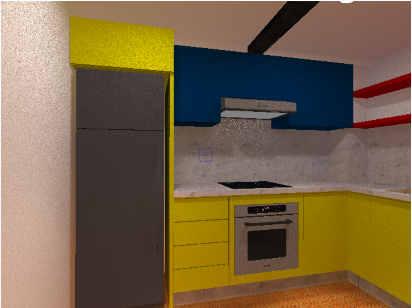 change the cabinet into a american walnut veneer with the countertop and backsplash in white corian the surface must appear seamless clean and subtly reflective wall cabinets in medium dark gray matte lacquer finished should be smooth non reflective include indirect lighting under cabinet led strips the lighting should create a soft ambient glow add in both sides of the wall cabinet a floating wood shelf into walnut veneer with under indirect led strips the appliances of the refrigerador oven must be represented in stainless steel with realistic reflections and finishes the cooktop is a 4 burner electric cooktop the lightning should be warm and balances the floor change into a laminate dark walnut veneer flooring and white plaster finish on walls and ceiling change the yellow material into american walnut veneer add the kitchen decorating like spice containers whit glass jars with wooden lids change the faucet for a high arc stainless steel single handle kitchen faucet change the red material of the shelves into a american