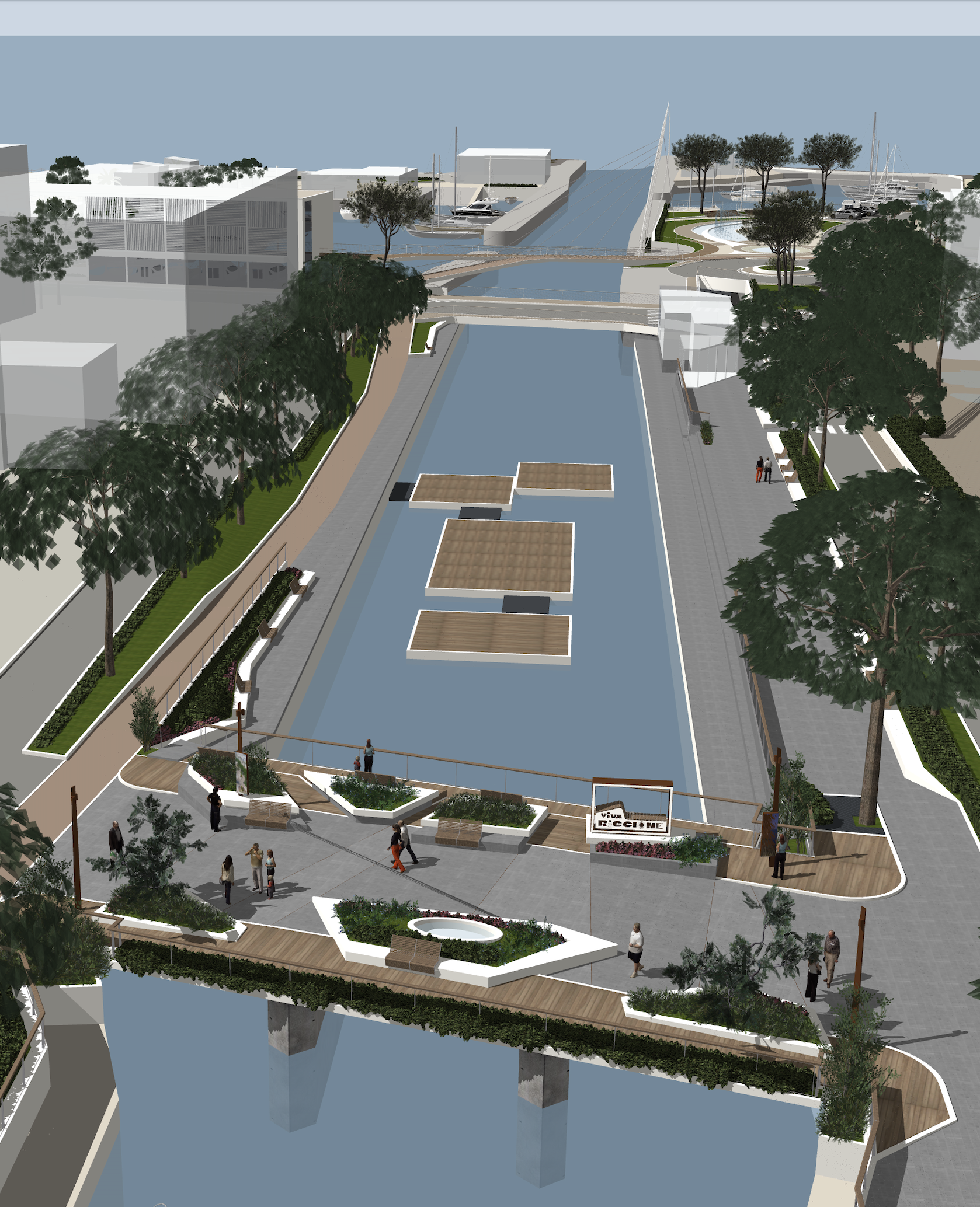 new street furniture on the river it s a warm summer night a band is playing on four floating platforms and numerous acrobats and jugglers are putting on a show many people are watching the show from both banks sitting on the steps and from the bridge enjoying themselves immensely the entire area is illuminated with atmospheric lighting