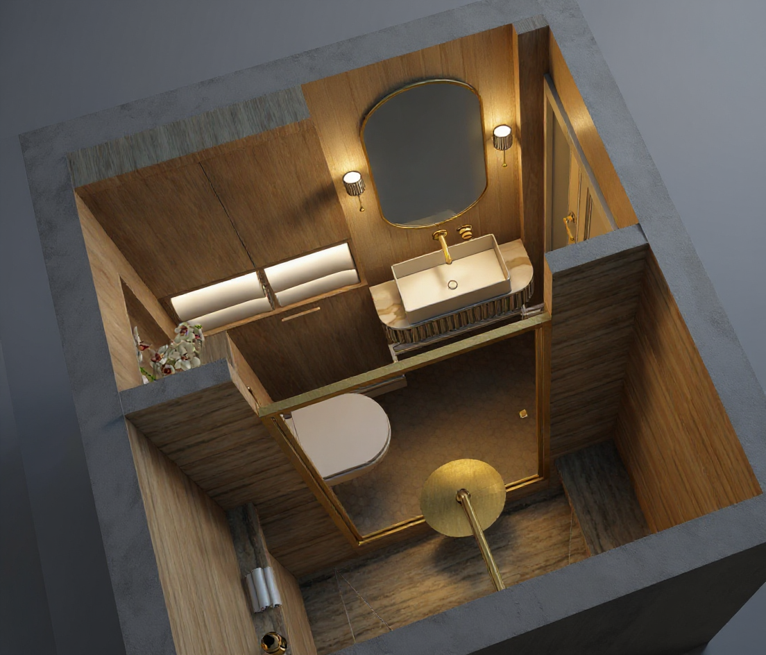 render a luxurious modern bathroom filled with natural light create a serene and elegant atmosphere with neutral tones use soft beige for the walls polished glass for the shower and warm gold for the fittings and fixtures incorporate white fluffy towels hanging inside the shower the bathtub should be sleek and modern in a clean white design the vanity with a light grey marble countertop and rich wooden drawers with gold handles the floor should be a dark slate gray contrasting beautifully with the overall light color scheme enhancing the tranquil ambiance