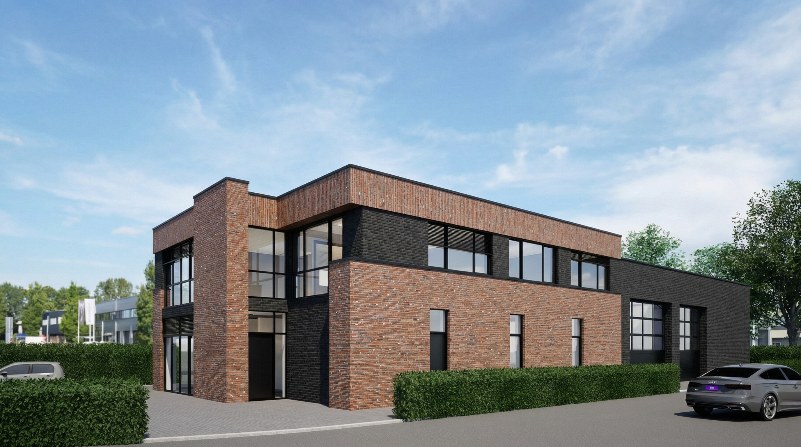 2 building has the exactly same material pattern but mirror white board and batten black post and window city environnement