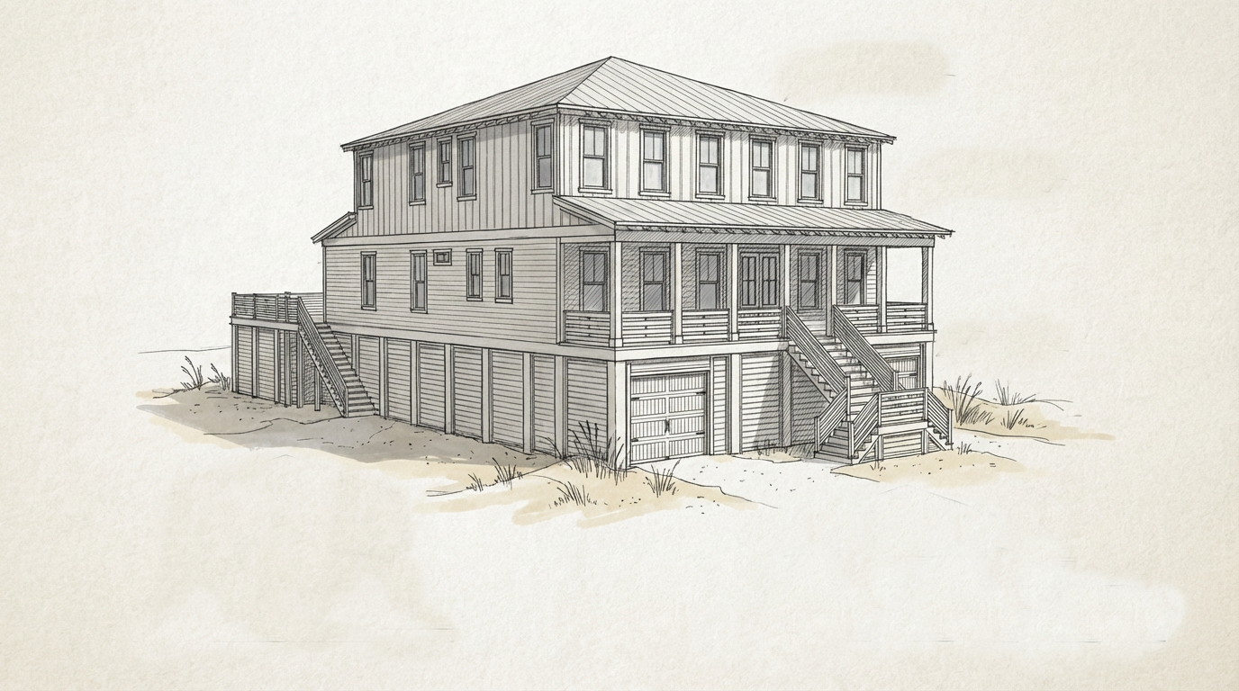 the house should have a white exterior with a silver metal roof and palm trees should be placed so that they do not overly block the view