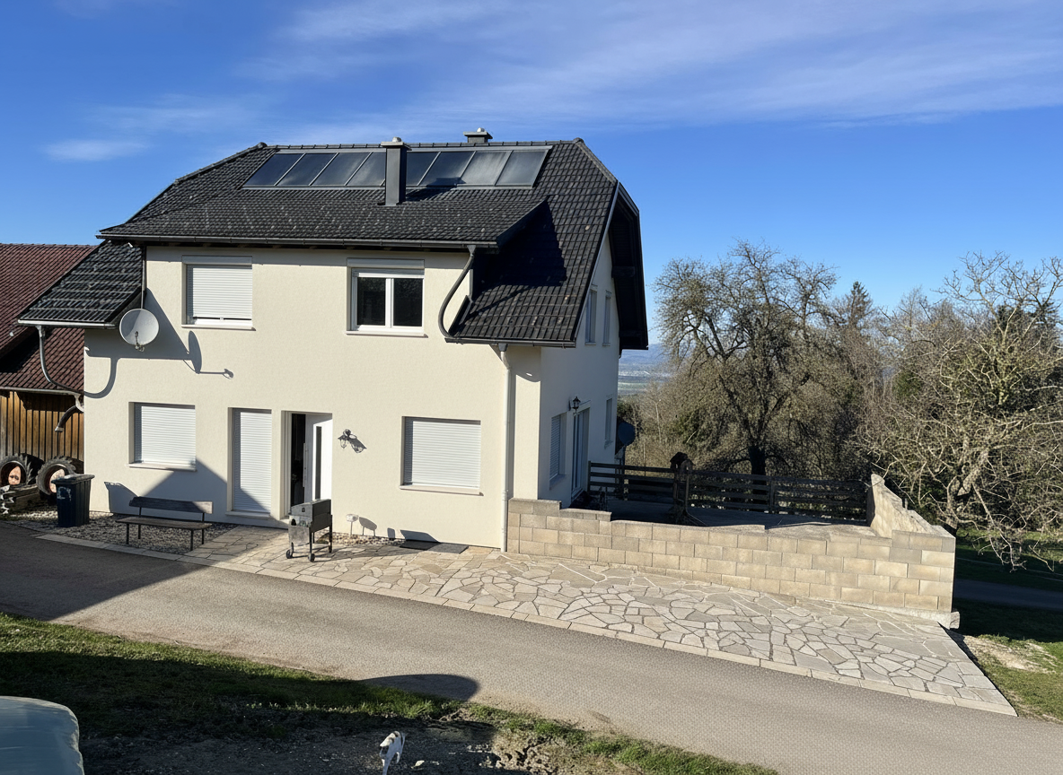 can xou make the facade of the house in pearl egg shell and a flat surfsce die einfahrt soll mit natursteinen sein remove the car auf drr terasse kommt ein holzbelag hin und die mauer wird ein bisschen offen