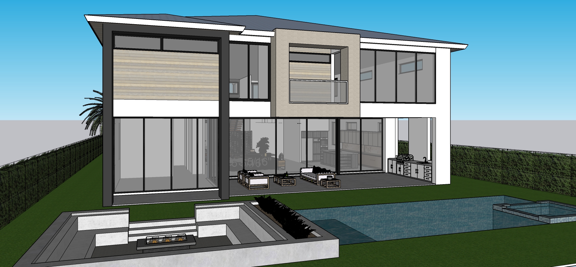day blue sky with some clouds professional photography shot keep house layout structure and proportions please maintan the perspective image black metal roof add neighborhood high end houses
