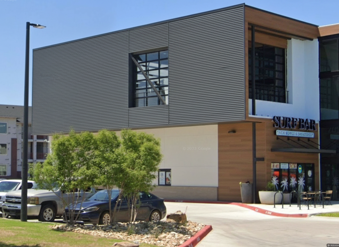 render a hyper realistic modern high end contemporary three story house in florida setting where there are palm trees maintain the window design the garage door is a sleek modern design in matte gray with wide horizontal panels and narrow glass inserts that create a clean contemporary look while letting in controlled natural light the roof is gray metal roof featuring a mix of gray brick white stone featuring large windows the exterior features a horizontal walnut wood panels on the center where the 3 windows are located the finishing around the garage doors are light gray bricks the entrance includes a square arched in dark gray brick finish the main door is 6 feet wide made of frosted glass with 4 horizontal mulls the trellis are all in walnut brown the walls are a soft white with a smooth finish creating a serene and inviting atmosphere with lots of greeneries and landscape and with dramatic sky