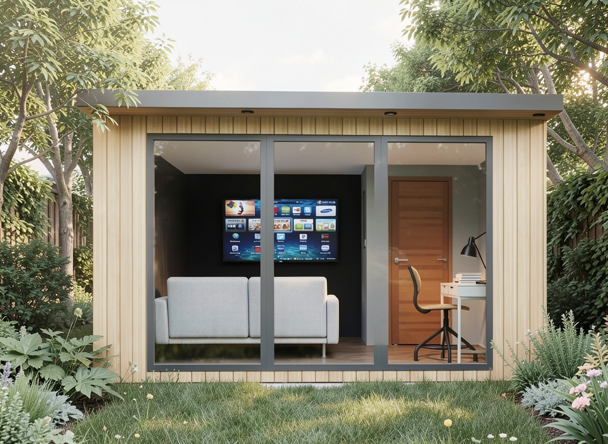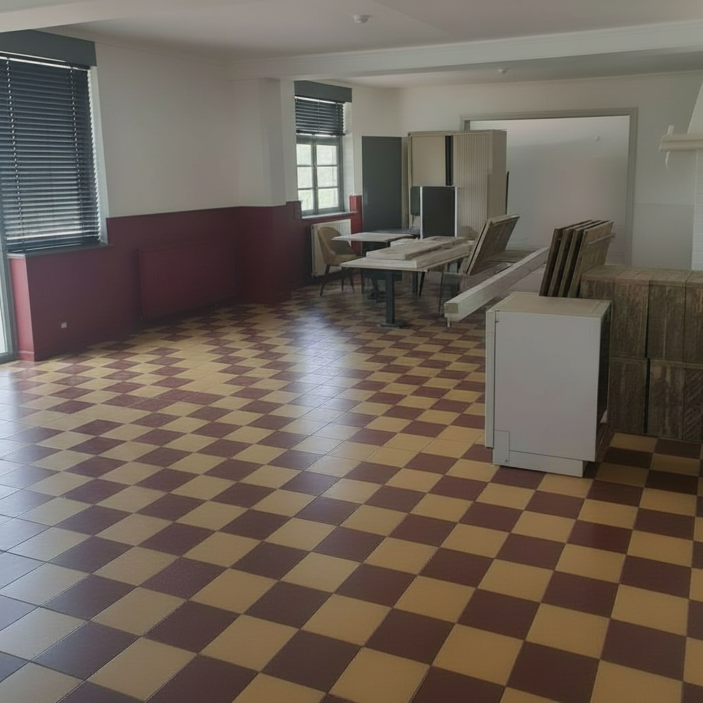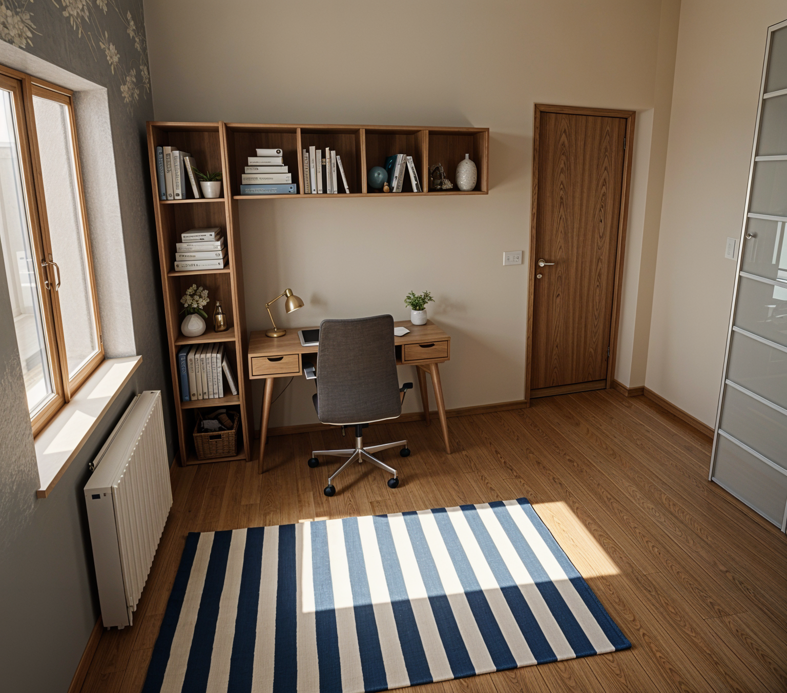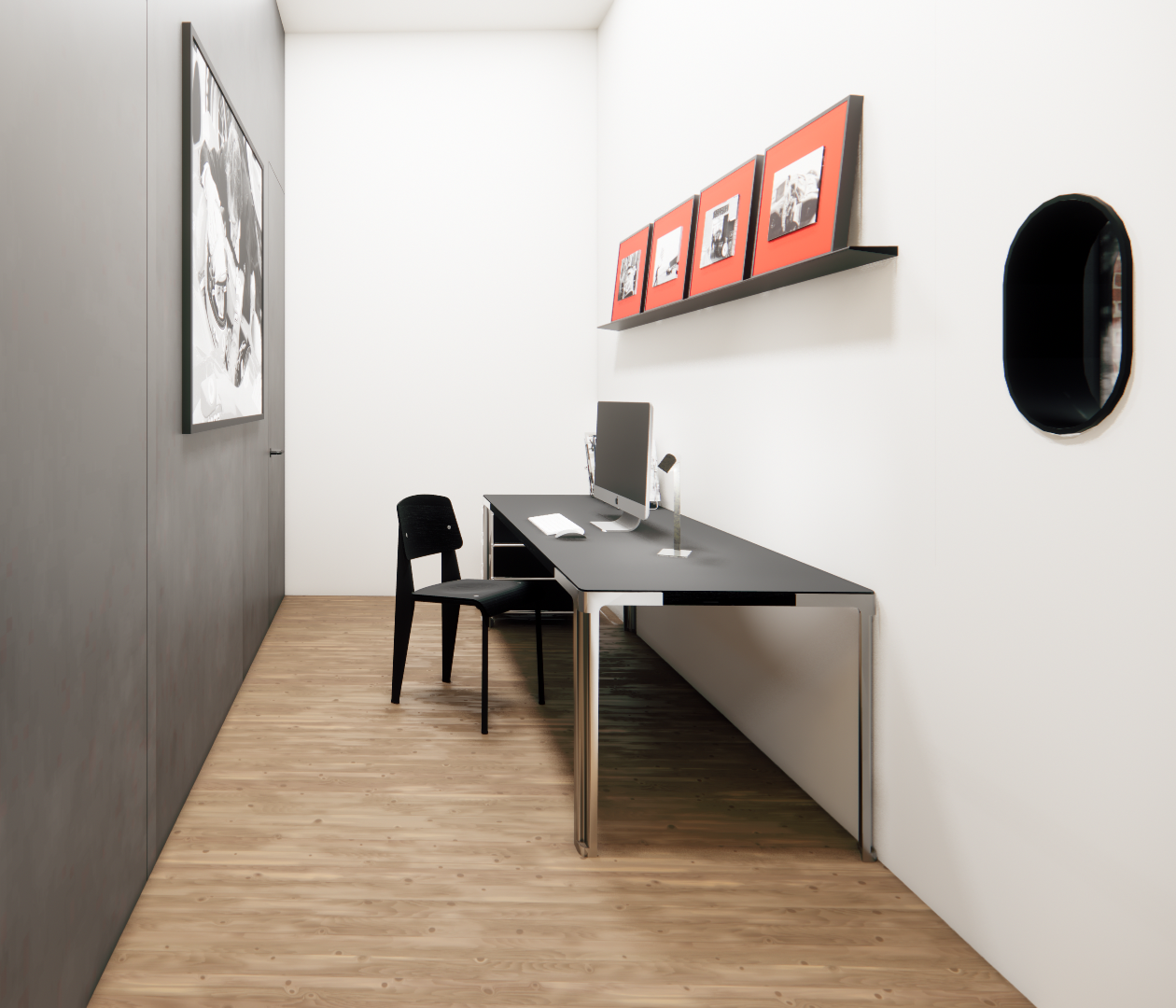architectural interior render minimalist home office study crisp white walls with warm medium tone oak hardwood flooring large matte black l desk with brushed metal legs black wooden chair apple imac monitor with keyboard and mouse black rolling usm style filing cabinet slim wall mounted black picture ledge shelf displaying four red matted black and white vintage ferrari racing photographs oval black framed mirror on side wall large black and white picture hanging on left wall small modern desk lamp clean corner composition sharp daylight illumination photorealistic 8k architectural visualization no shadows bright even studio lighting