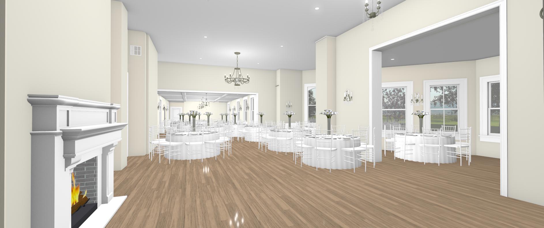make chandeliers sparkle make wood floor brazilian cherry add crown molding make walls lighter warmer white remove all fire in fireplace add mirror with thin gold frame above fireplace revise all chairs to chivari chairs that are redish brown make chandeliers crystal with sparkle make views from window more flowering trees and sunset view remove all the fire in the fireplace no fire in scene at all make windows see through make view through the clear windows to be flowering trees