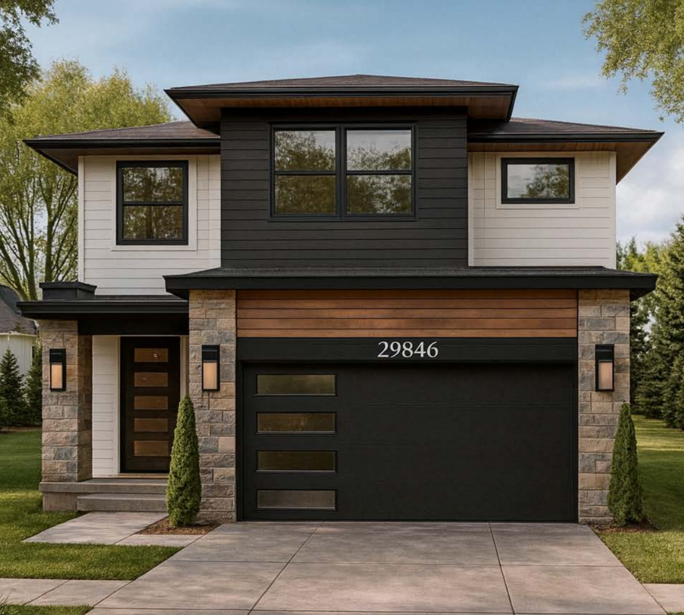 generate a cinematic vertical real estate presentation animation from this house render camera movement slow upward tilt revealing the full facade from driveway to roofline add lifestyle atmosphere soft sunlight reflections subtle moving tree shadows warm welcoming exterior lighting near entrance slight sky motion mood luxury suburban living new construction showcase investment ready property keep facade materials unchanged soft cinematic color grading aspect ratio 9 16 duration 7 seconds ultra realistic style