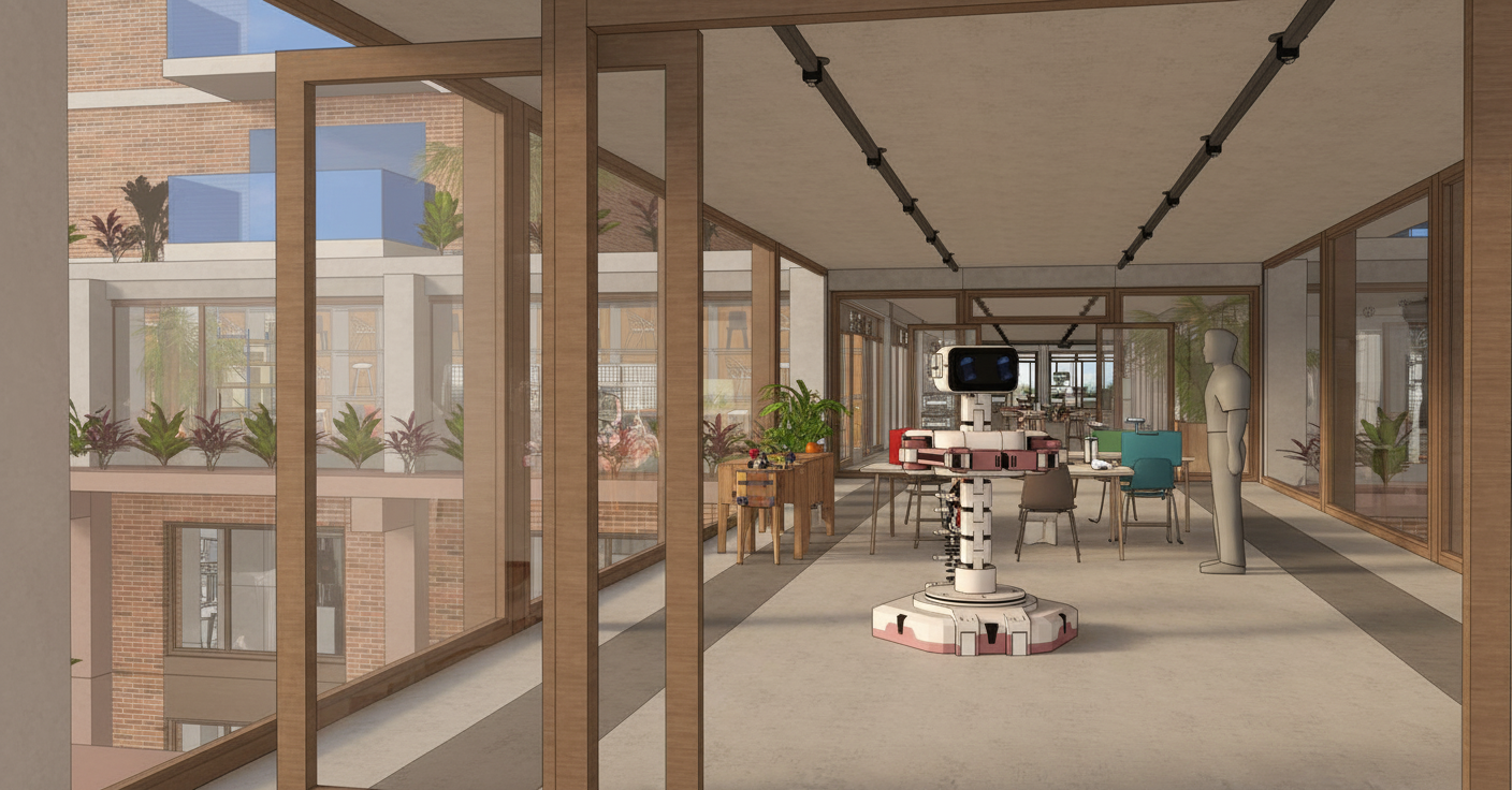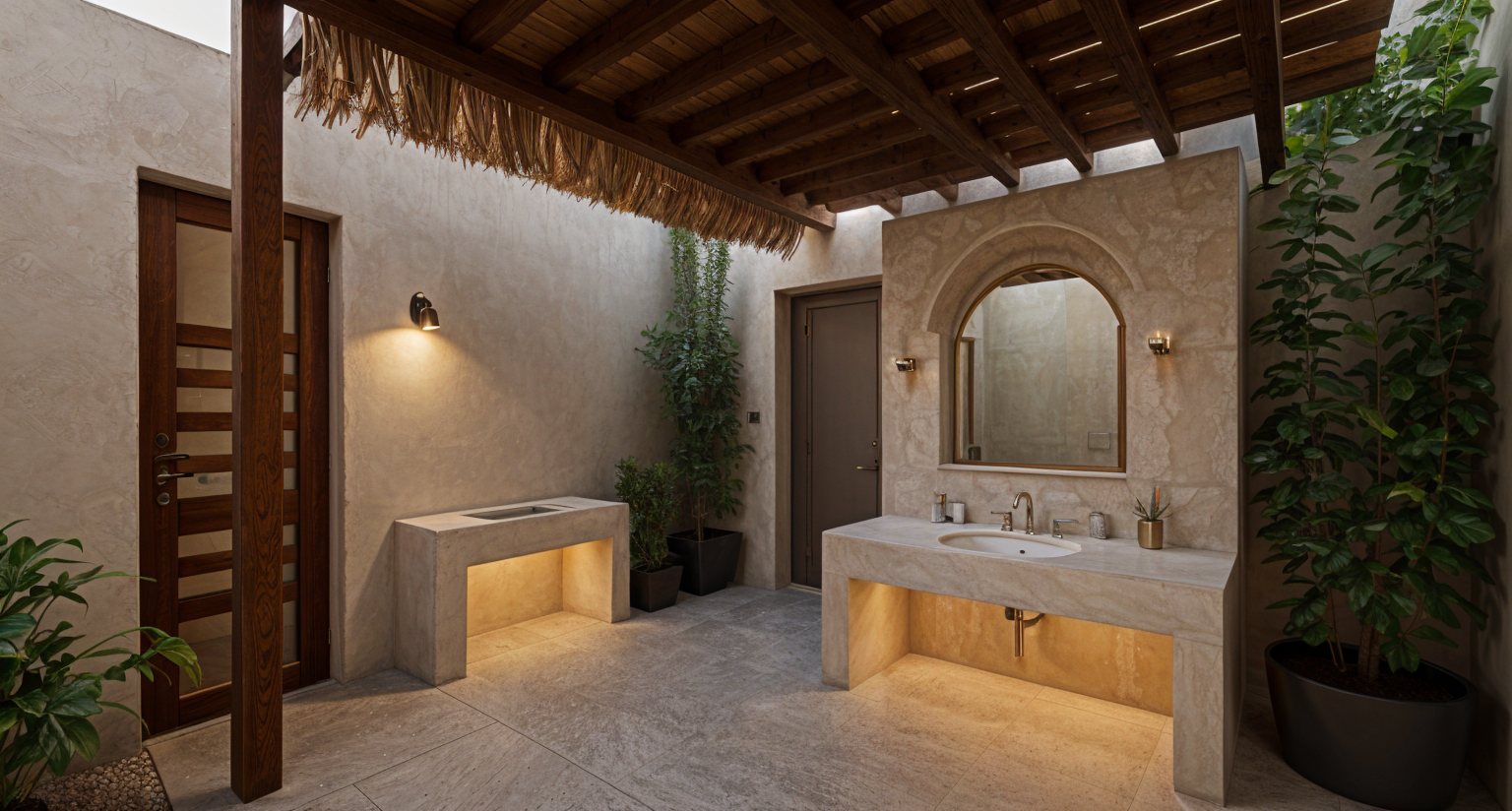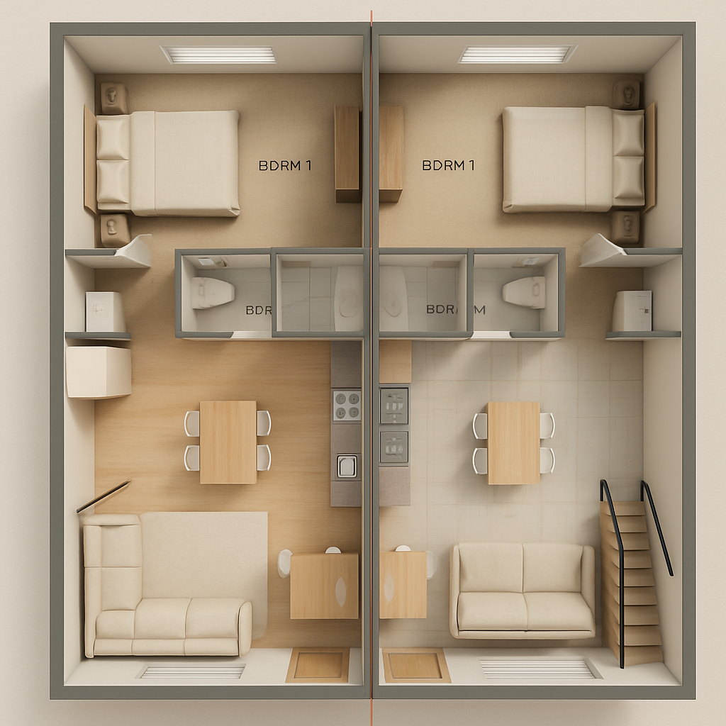 interior shot create a detailed architectural rendering of a modern duplex apartment floor plan use a soft cream color for the walls to create a warm and inviting atmosphere for the living room and kitchen area incorporate sleek light oak flooring with minimalist white furniture paired with pastel accents the bedrooms should have calming soft gray walls and plush beige carpeting with modern simple wooden furniture highlight the bathrooms with light blue tiles for a fresh and clean feel keep the overall atmosphere bright using large windows with natural sunlight casting soft shadows and add indoor plants to enhance the tranquility and aesthetics of the space rendering should be from the perspective of standing in the room