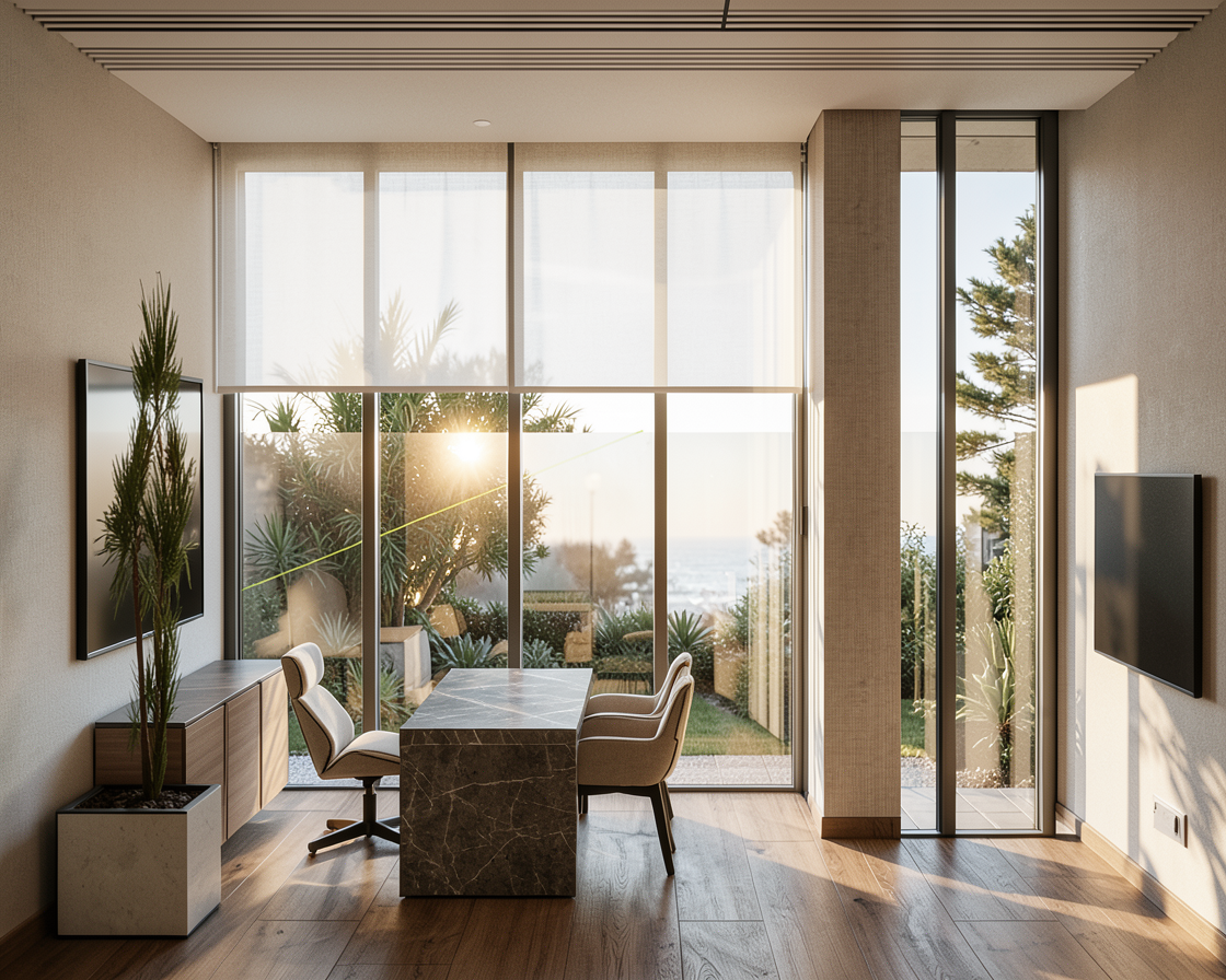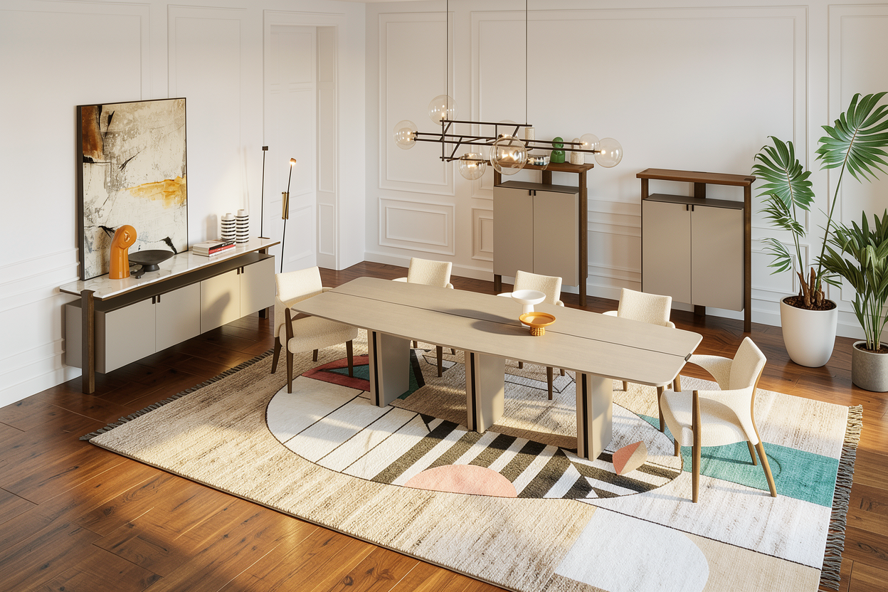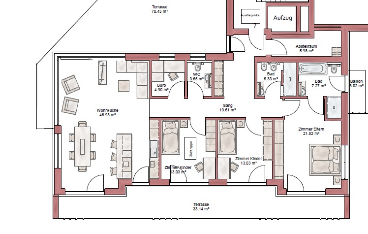 create a photorealistic top down floor plan rendering based on the attached 2d architectural drawing with the following requirements the exact room dimensions wall positions door and window positions as well as access routes must be accurately represented exactly as in the plan the output must be a true orthographic top view no perspective views no interior eye level renderings no axonometric or angled views the result should look like a real built apartment photographed directly from above with realistic materials and lighting not like a flat vector plan style materiality photorealistic surfaces use a contemporary warm minimalist interior style depicted through realistic surfaces visible from above color palette soft whites warm grays natural light wood matte surfaces black metal accents floor coverings hallway office and bathroom large format matte porcelain stoneware in warm gray bedrooms and living kitchen country style oak planks walls smooth plastered and painted in off white visible via wall thickness and color tone from above ceilings not visible unless a sectional representation style is used no suspended lights or hanging lamps shown room specific details in top view all rooms should be furnished exclusively in top view with realistic size and arrangement entrance storage living room low sofa in the middle of the room coffee table rug subtle decoration tv on the wall dining area simple dining table with chairs adapted to the traffic routes kitchen handleless fronts in light wood and matte taupe countertop in warm white quartz integrated appliances kitchen island as drawn in the plan master bedroom upholstered bed nightstands rug built in wardrobe children s bedrooms one furnished like a youth room the other furnished like a children s room bathrooms floating wooden washbasin walk in shower with clear partition according to the plan wall mounted wc windows light windows with slim black frames soft natural daylight falling on the floors according to window positions no dramatic cast shadows from camera angles the light should appear as even natural overhead light rendering requirements use photorealistic pbr materials realistic surface textures subtle reflections and global illumination clean tidy presentation door opening directions visible from above and existing furniture from the original plan retained with correct scale and movement areas output a single high resolution 4k photorealistic top down floor plan rendering no perspective images no interior eye level views no angled or axonometric representations only the floor plan depicted as if photographed directly from above