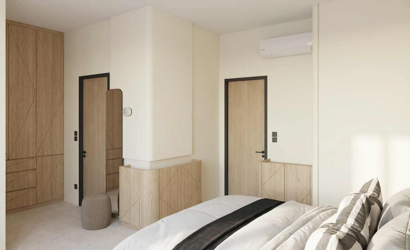 light and soft timber finished for the wardrobe the atmosphere is serene and inviting with natural light softly filtering through an unseen window casting gentle shadows across the room for a peaceful ambiance