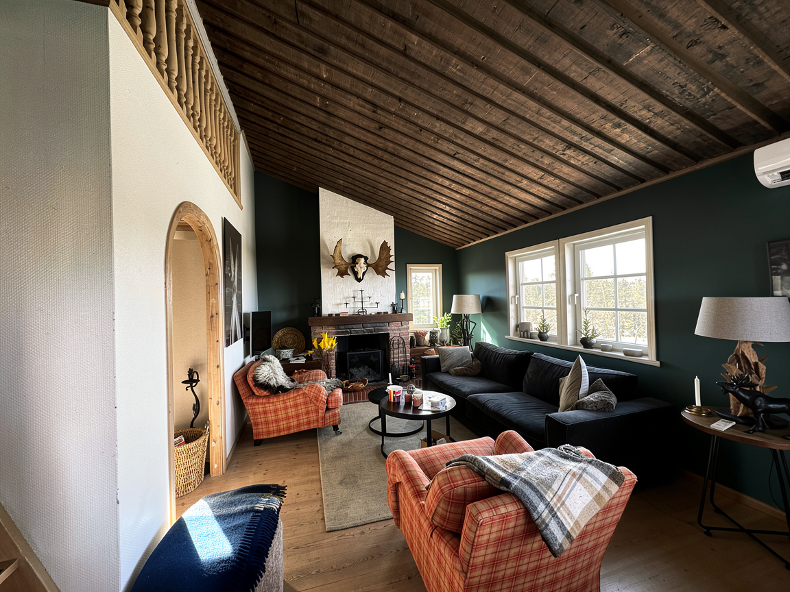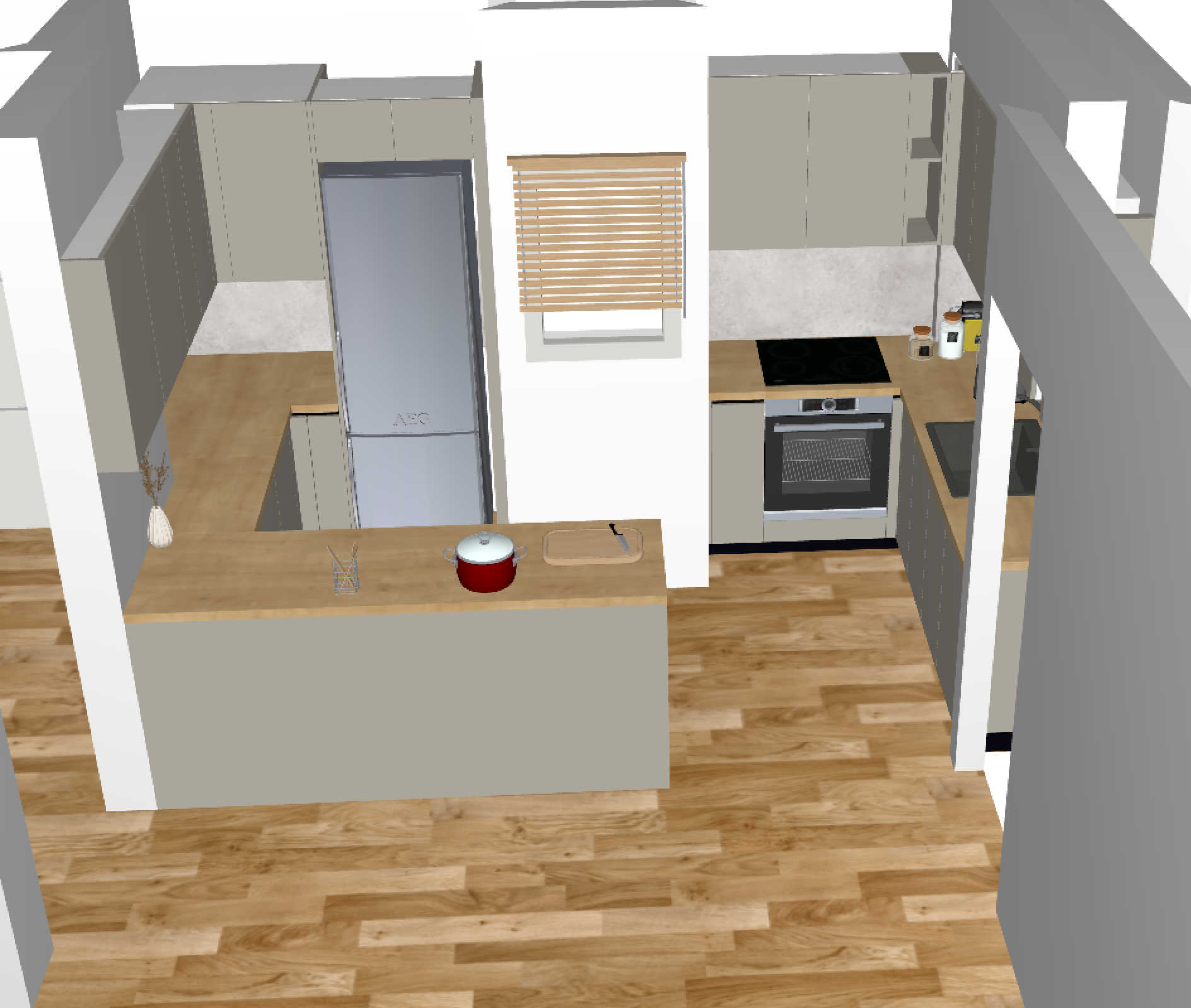 render a modern kitchen interior with a warm and inviting atmosphere design the cabinets in a soft taupe color the countertops in a light natural wood tone and the walls in a clean bright white incorporate a light oak wood floor that complements the countertops feature a silver metallic refrigerator and a sleek black stove add small accents such as a red pot on the countertop for a pop of color include a simple vase with dried flowers in a neutral tone illuminate the space with soft natural lighting filtering through wooden blinds on the window