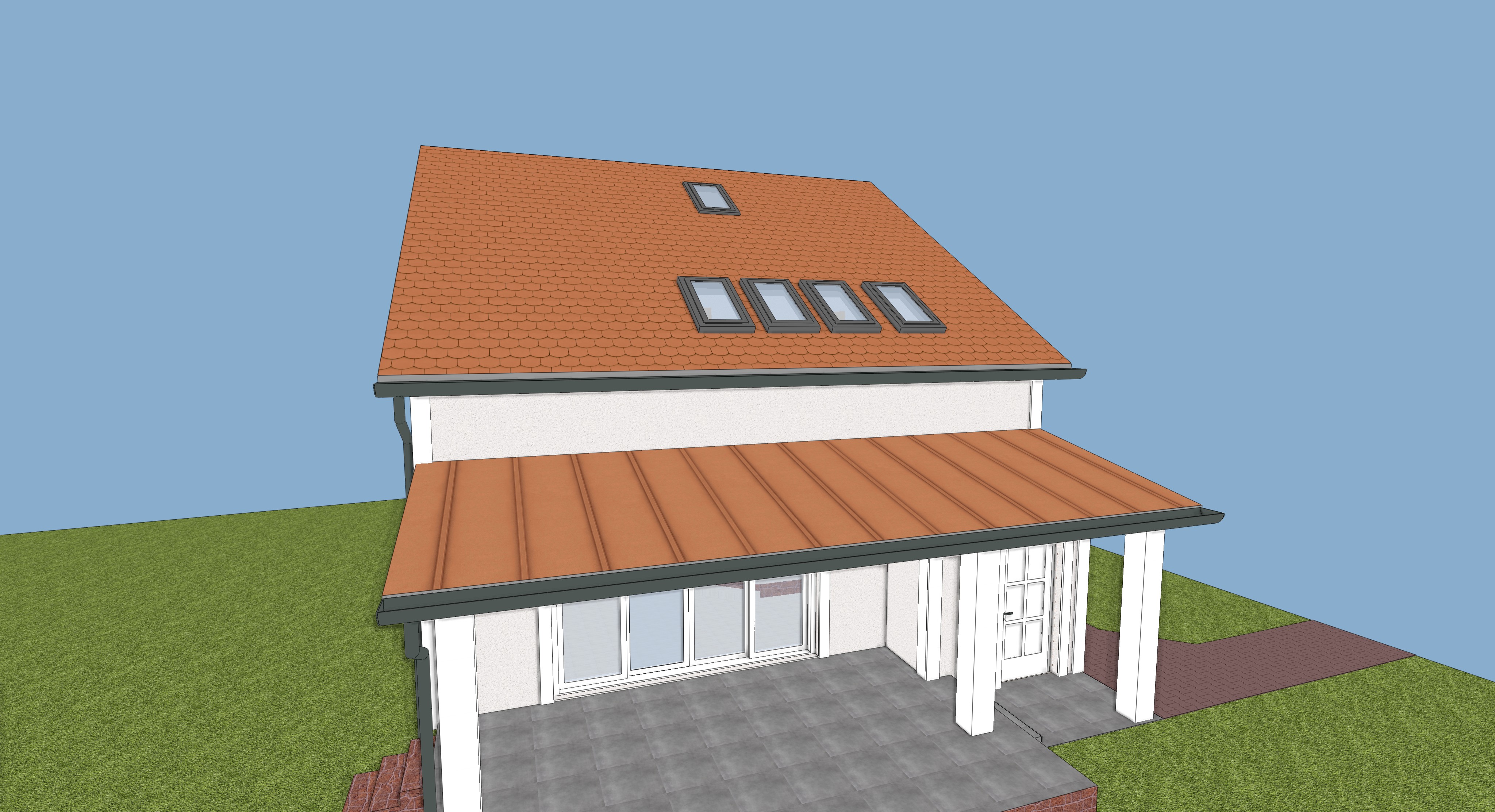 render a modern house with a pitched roof featuring terracotta tiles in a warm burnt orange shade the walls are a pristine white with sleek grey window frames highlight the large window on the front with a clear reflective glass the porch is supported by white columns and the steps are in a cool grey stone the patio paving is a dark charcoal grey providing a contrast against the lush green lawn include a serene blue sky for a calm and inviting atmosphere