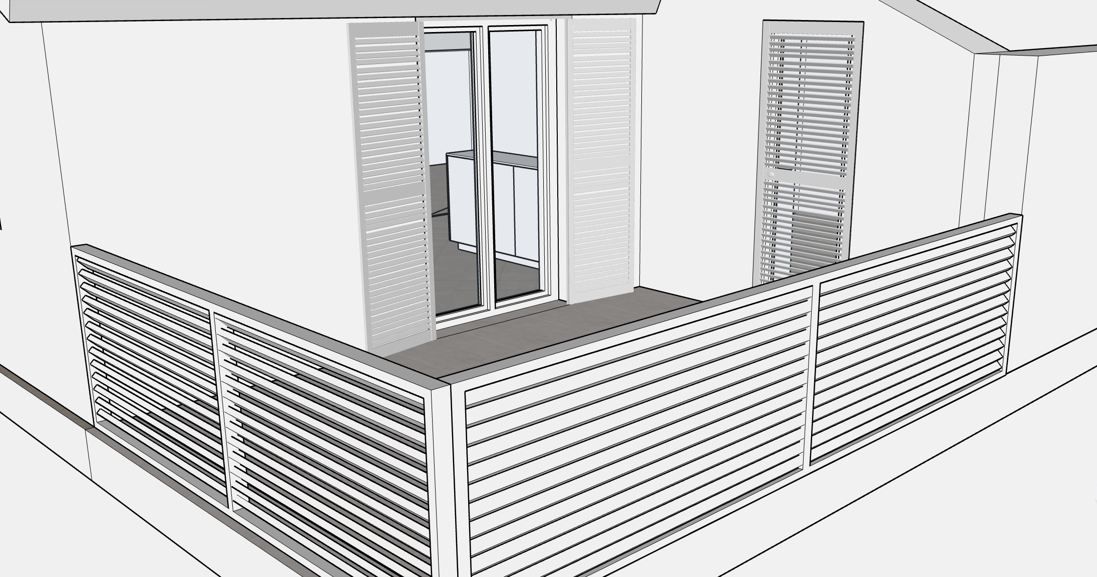 add round table for 4 for outside with 4 chairs make roof look like roof and make balcony look like mediterranean style