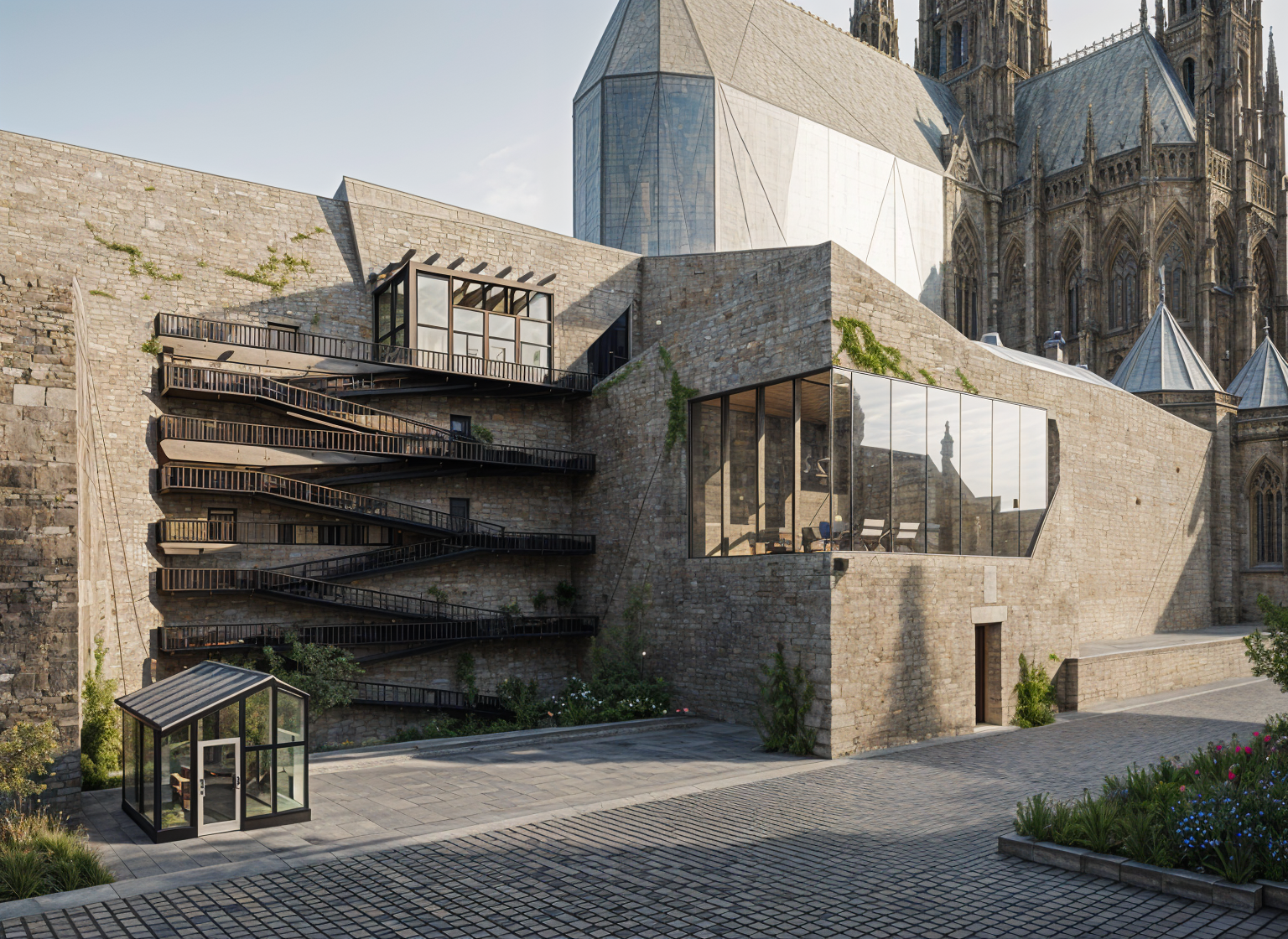 old abandoned building that is now educational center situated in prague castle concept in behind there is old st vitus cathedral small glasshouse and invalide ramps