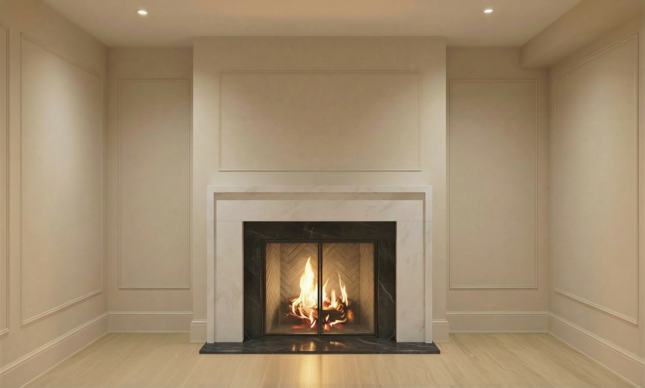 render realistic using white stucco with mixed brown color stone and black windows black accents black doors and black roofs set this is a residential neighborhood with large mature trees and very upscale landscaping provide shrubs and landscaping around the base of the house do not add any other additional structure to the house make the surround of the front door black and make the time of day dusk with lights do not add any other masses to the overall size of the house