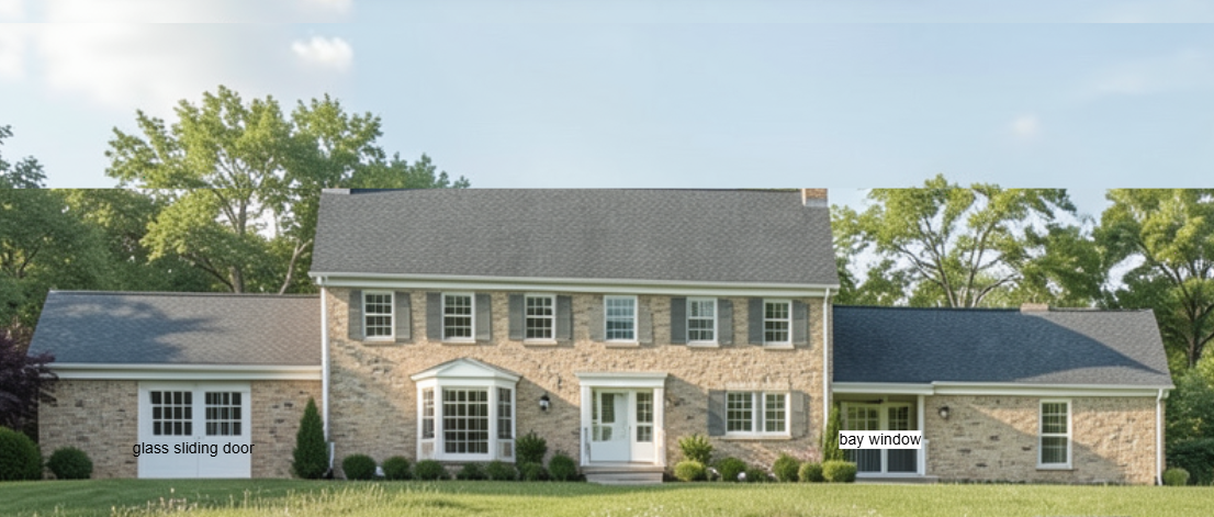 make a back elevation rendering of the back of house elevation nothing else add replace the glass sliding door and bay window where they are labeled