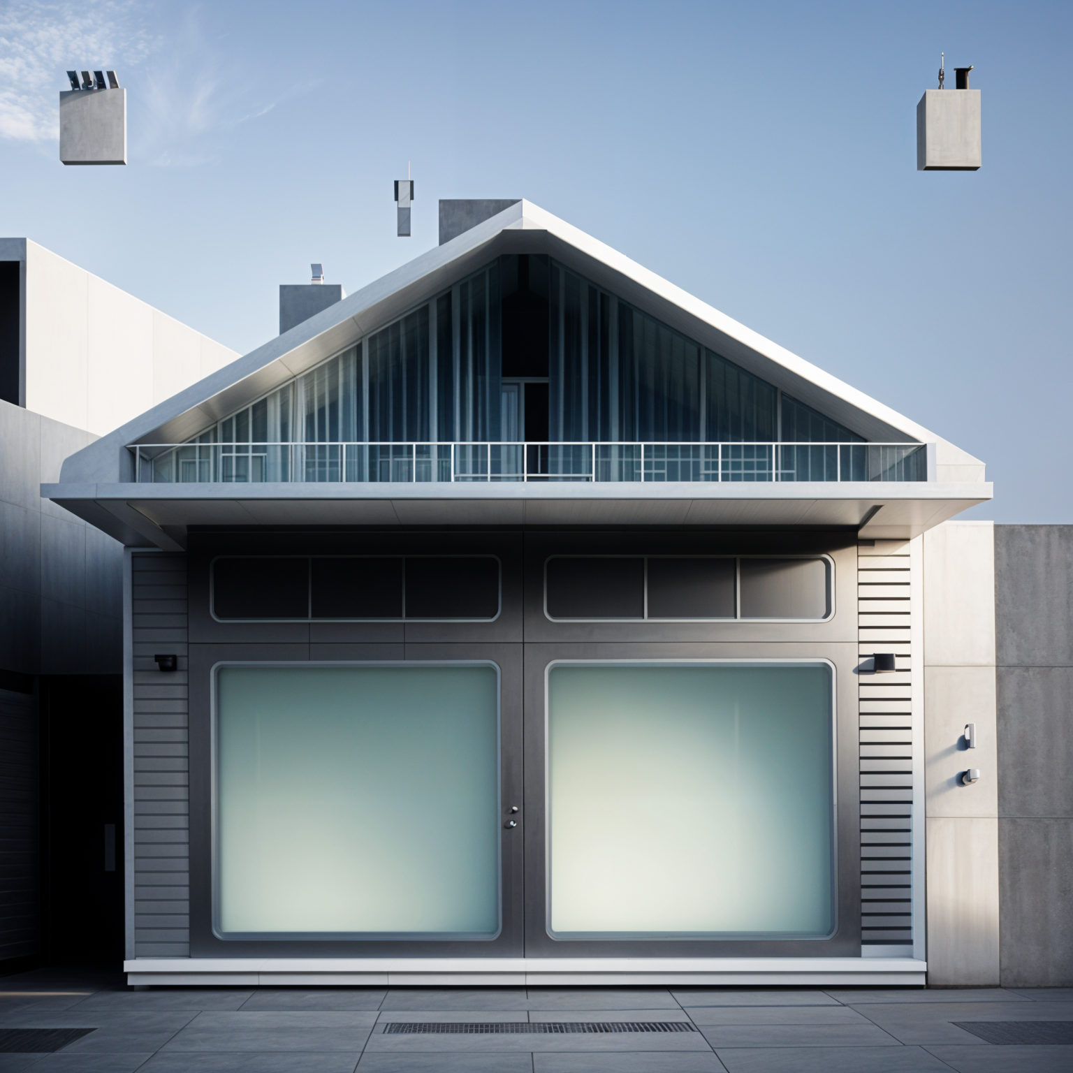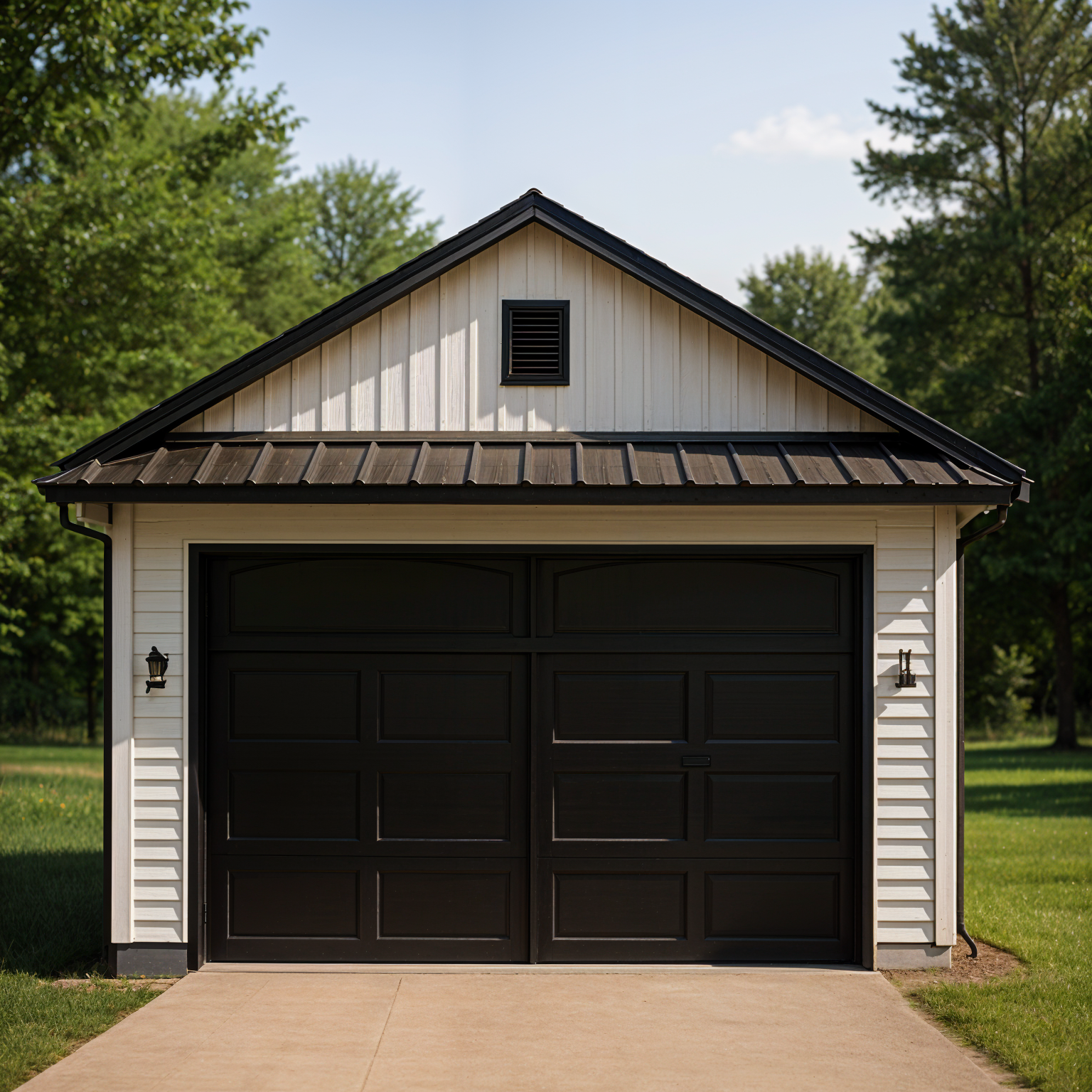 make this elevation into a rendering with board and batton siding on top white and white horizontal wood sisng on bottom black garage craftsman door and a metal roof above