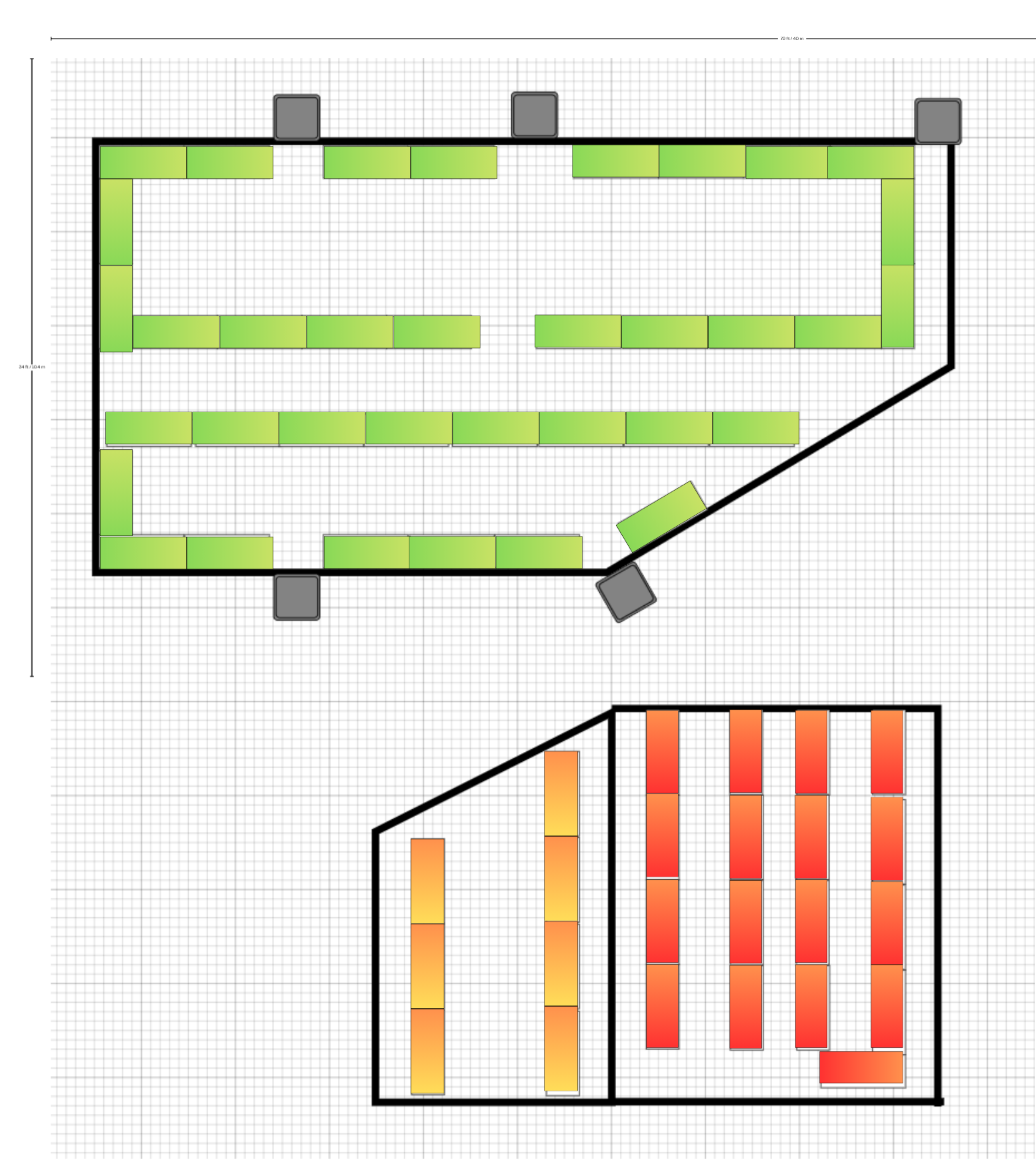 convert this floor plan into a realistic isometric 3d view of a full house show the space from an elevated angle with furniture walls and details visible the colored rectangle boxes are empty foldable tables use the same furniture as shows on the plan do not change the orientation of the floorplan