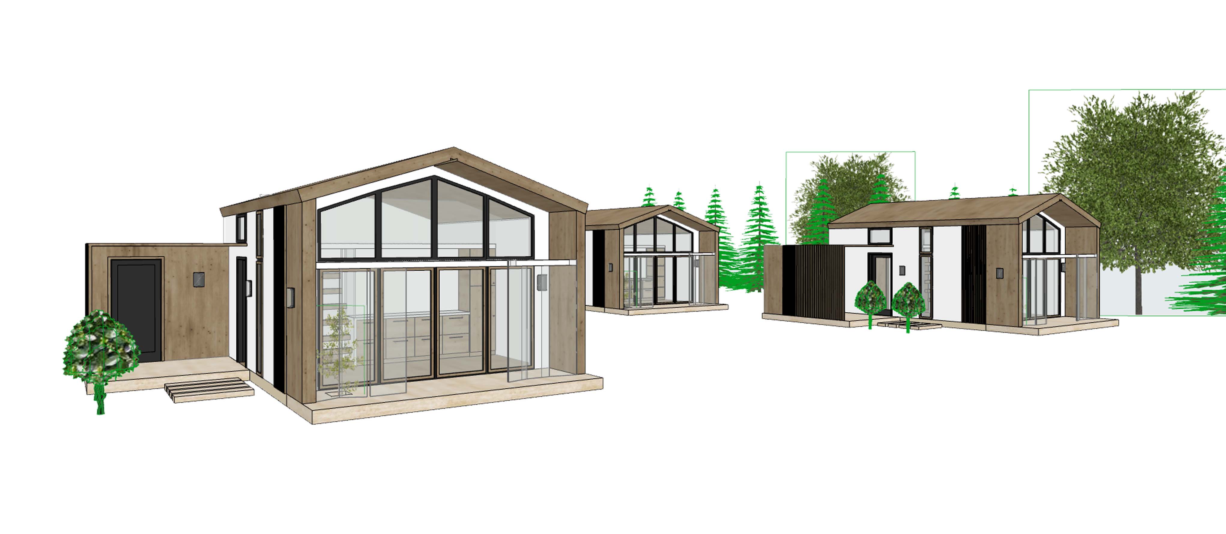 render a good picture of a colonial garden with these modern minihouses the houses have small paths between them and are surrounded by norwegian wood the houses have a garden in front of them and small parcels with vegetables sunny weather