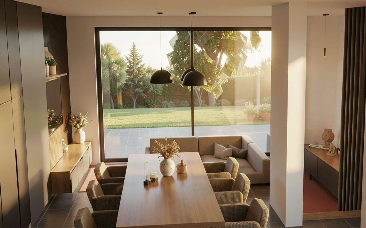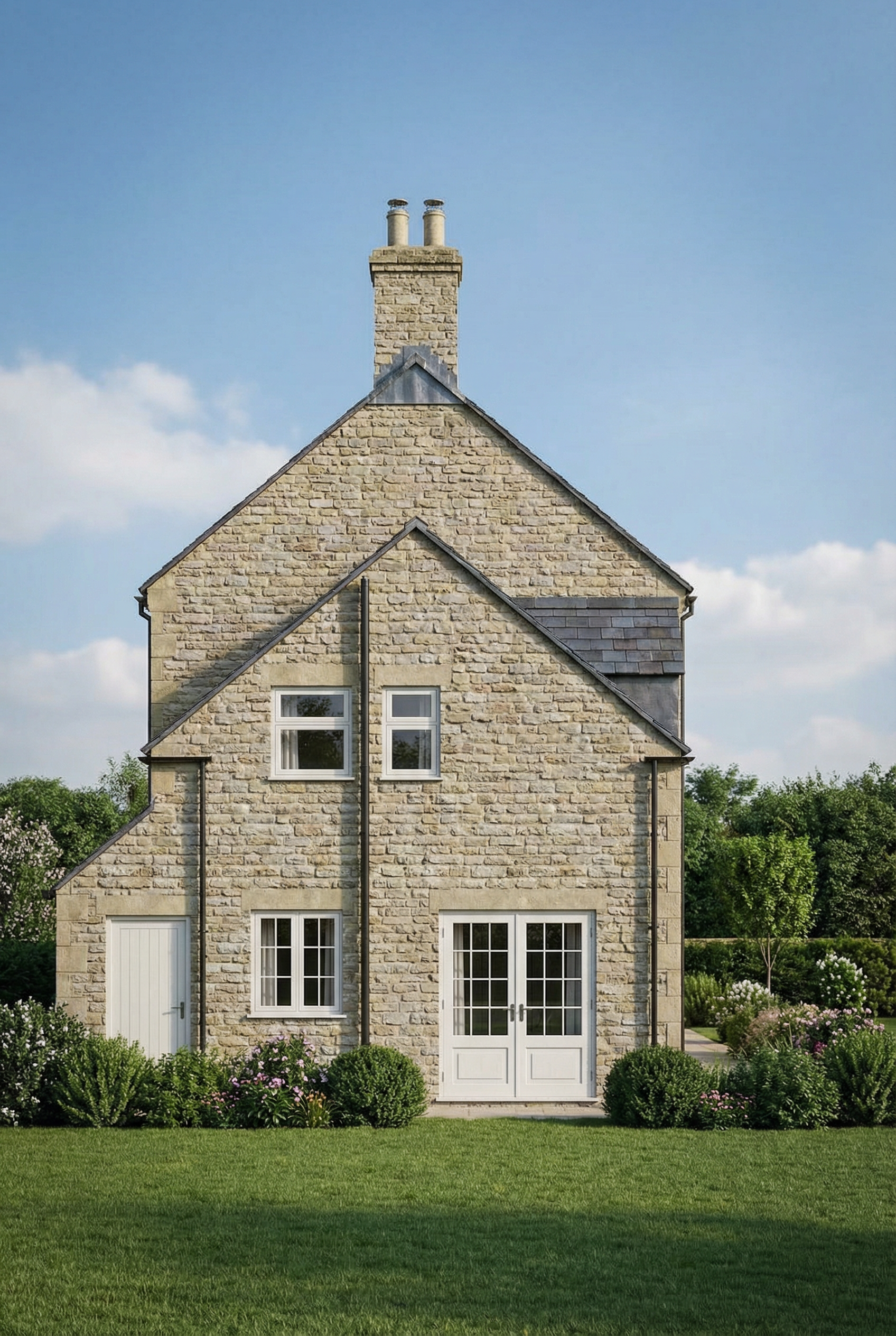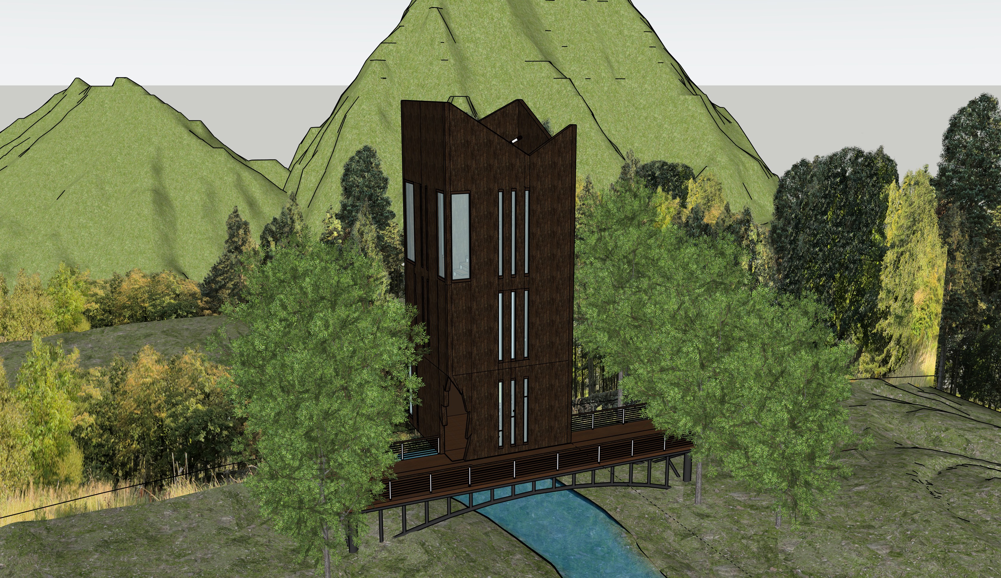 dont alter or move anything in the image populate this space with people moving in and out of the building make the trees look more realistic and the outside of the building a dark bark material which looks real and make the terrain more realistic of the highlands all figures should be on the bridge add a forest at each end of the bridge so u cant see there end ensure the entrance shape is kept and all the structure and windows etc is kept the same as my model