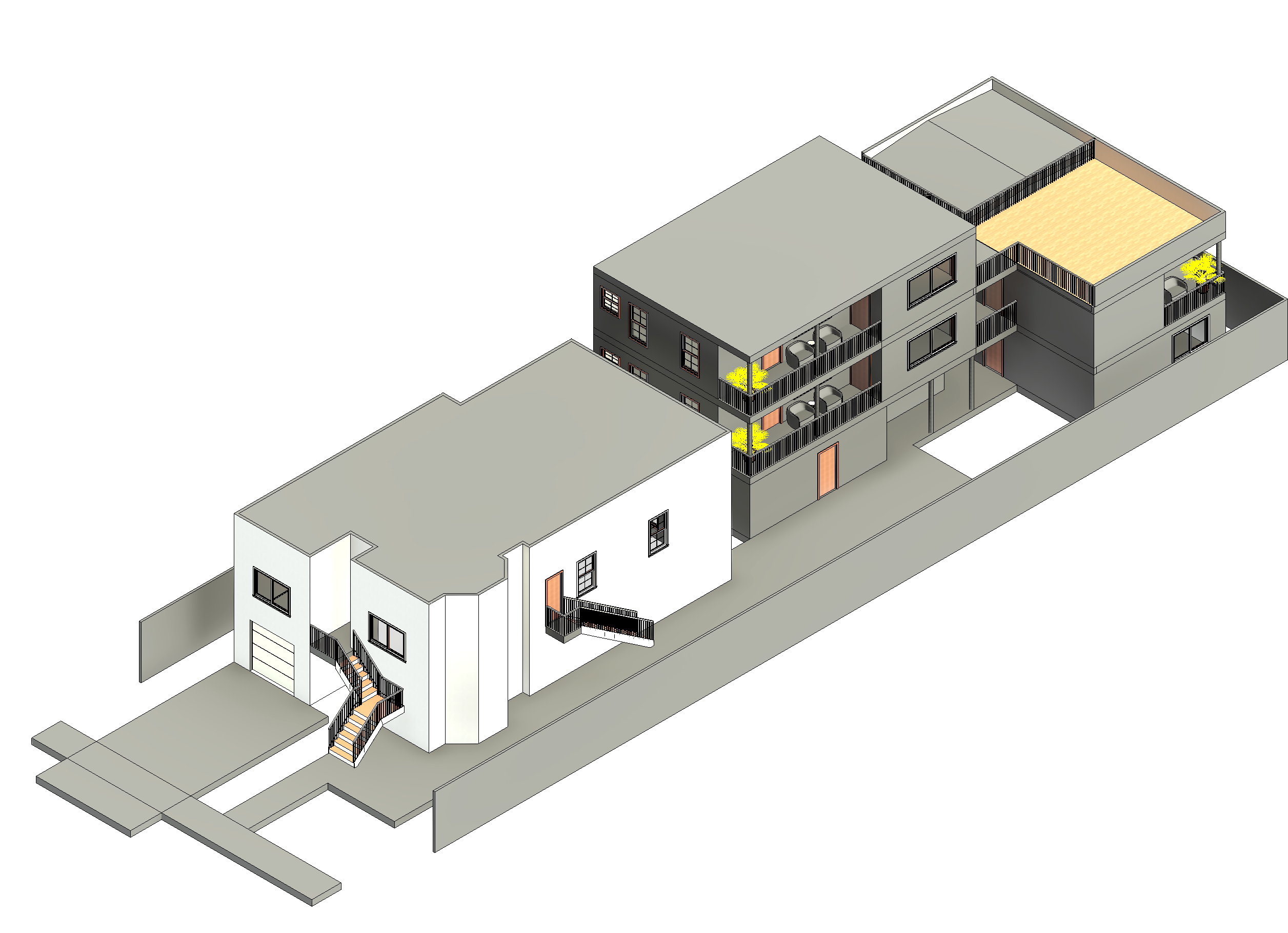 convert this floor plan into a realistic isometric 3d view of a full house show the space from an elevated angle with furniture walls and details visible new building in a residential california neighbourgh with plants we re is white foreground is grass with plants polished concrete build is beige warm tones at gonden hour with soft shadows and wall on the side are fences use the same furniture as shows on the plan do not change the orientation of the floorplan